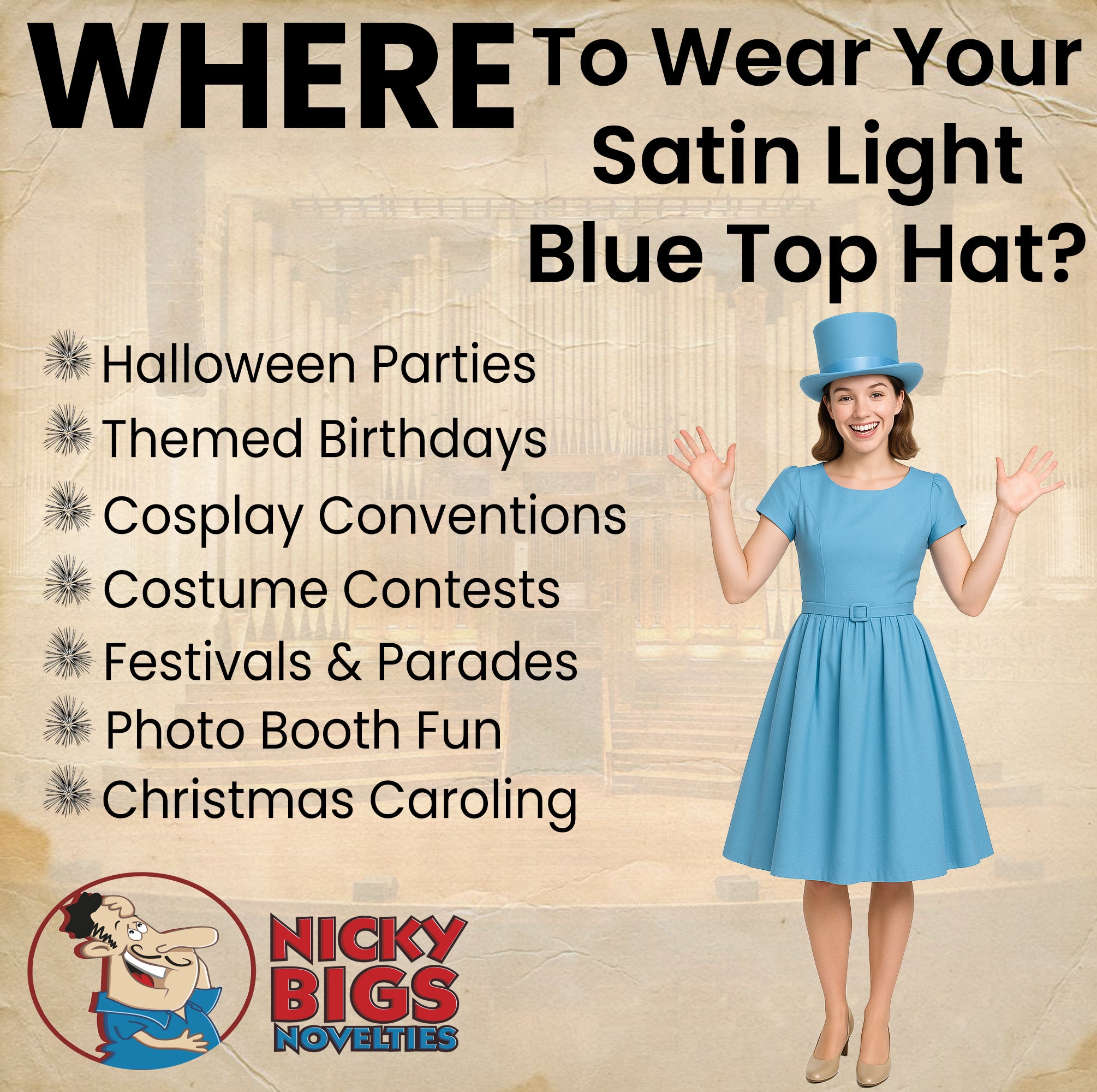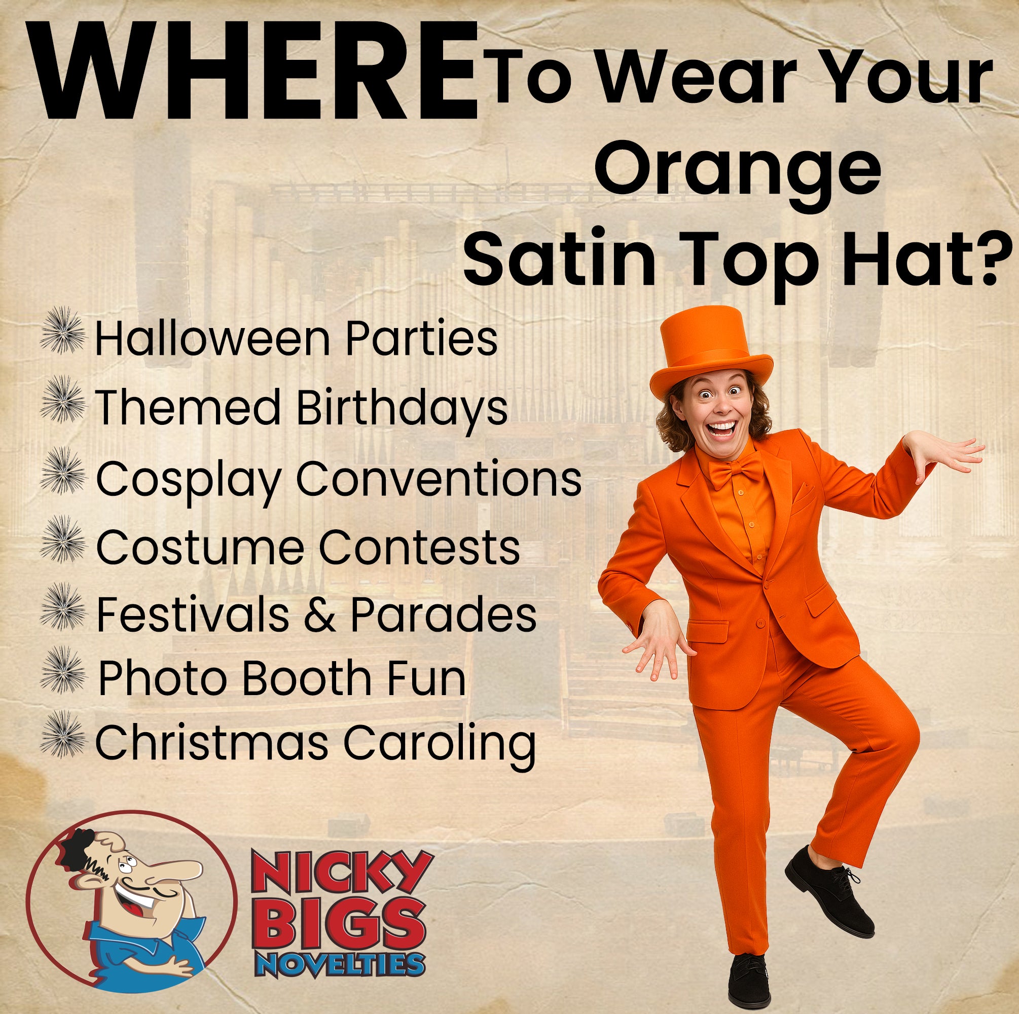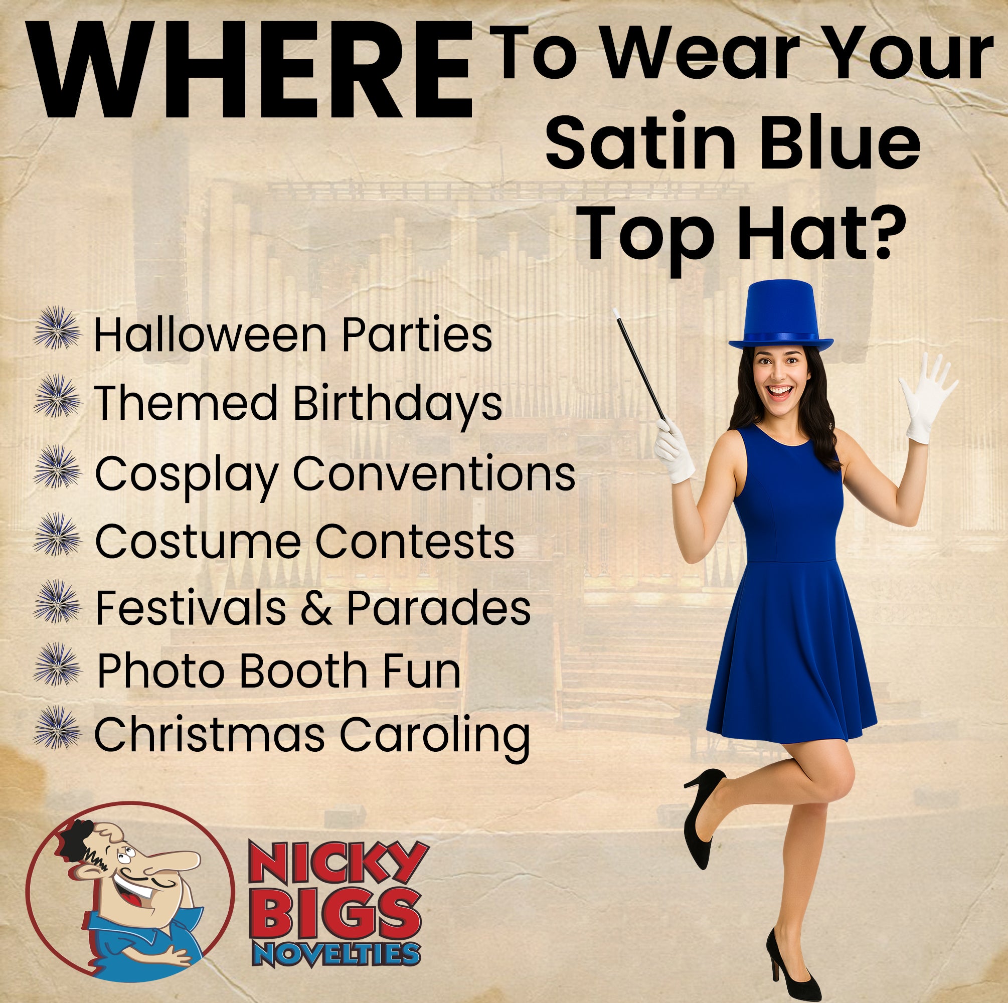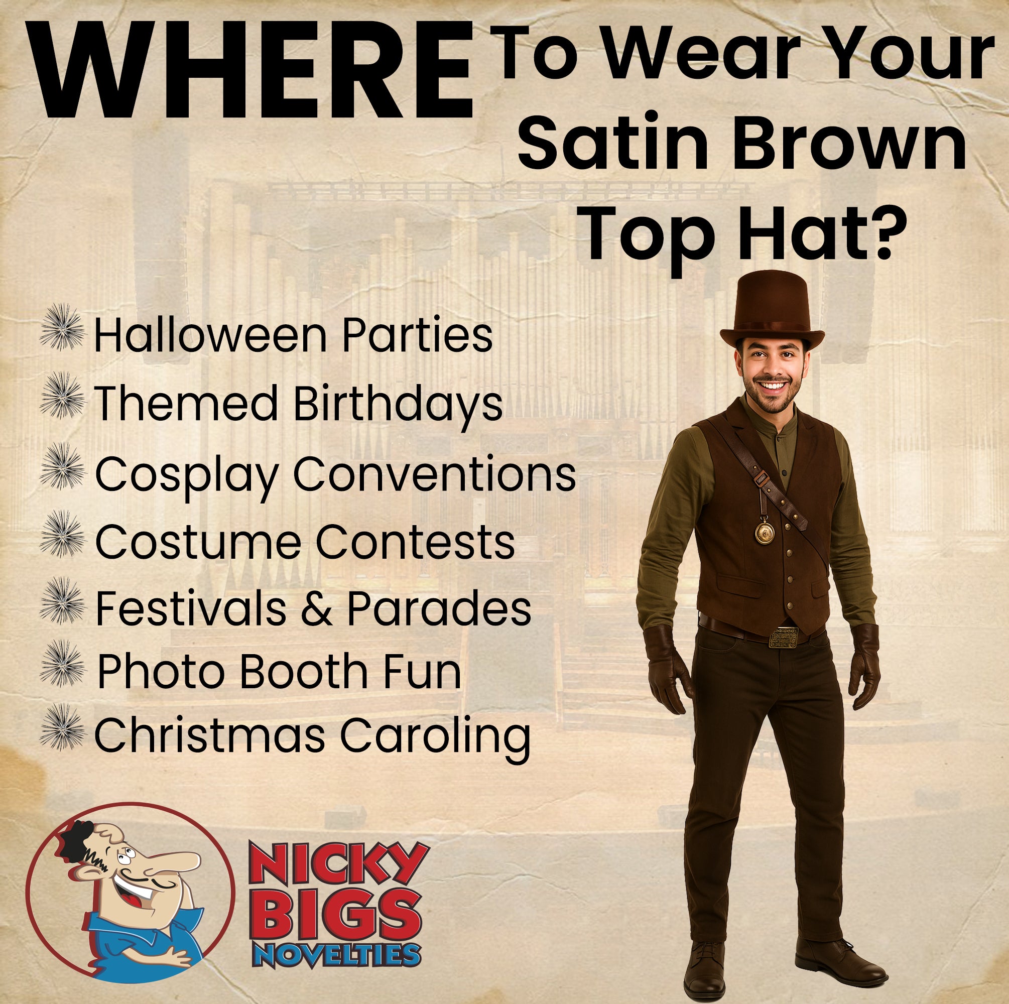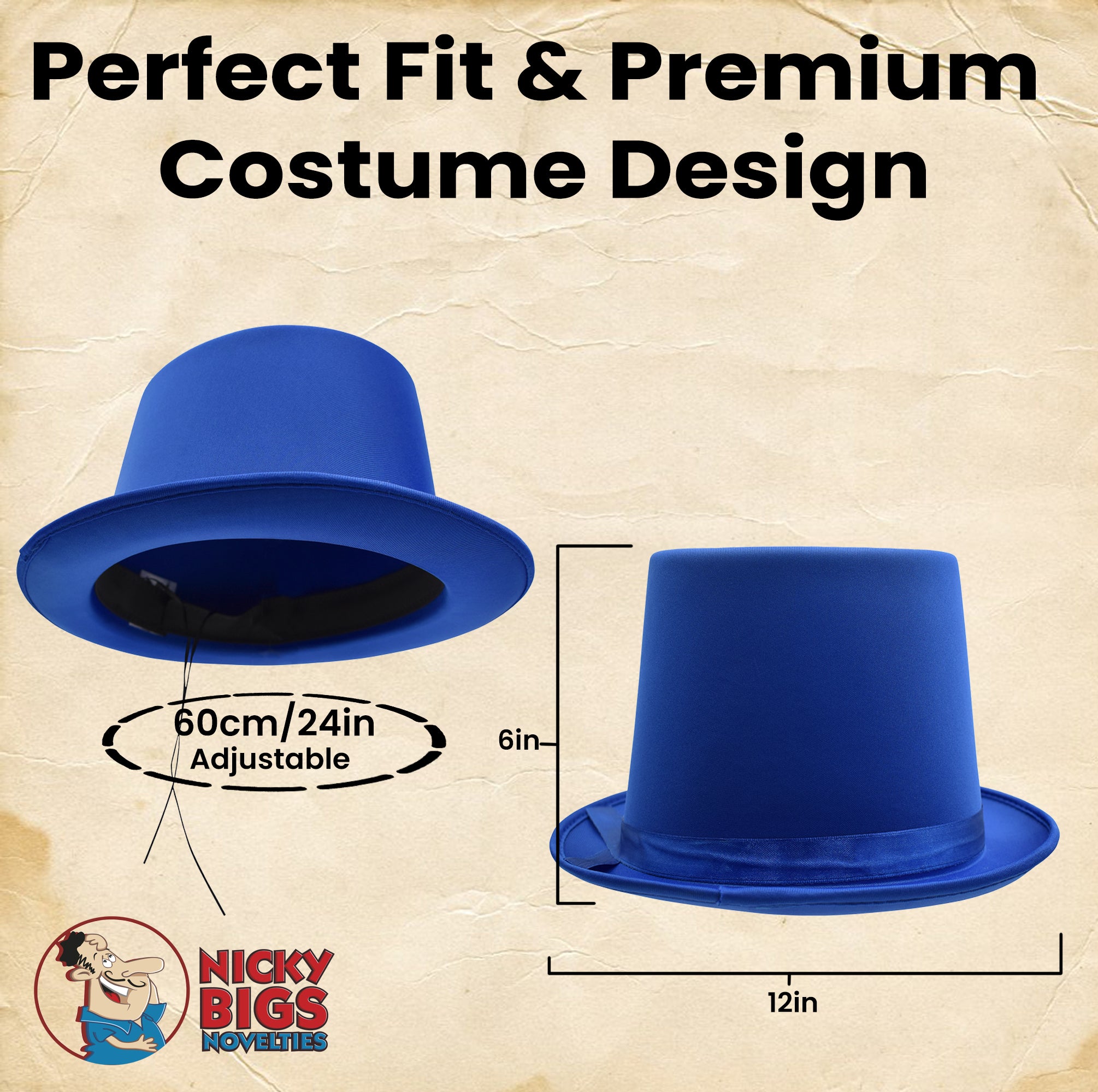 Elevate your look with the NickyâBigs Novelties Adult Colorful Satin Top Hat, a centerpiece of style from Marsinos Costumes, a beloved American, family-run brand with over a century of costume excellence. This vibrant, satin-wrapped top hat is available in eight standout colorsâred, blue, green, pink, purple, orange, black or brownâwith a matching satin band that catches the light and completes any ensemble.