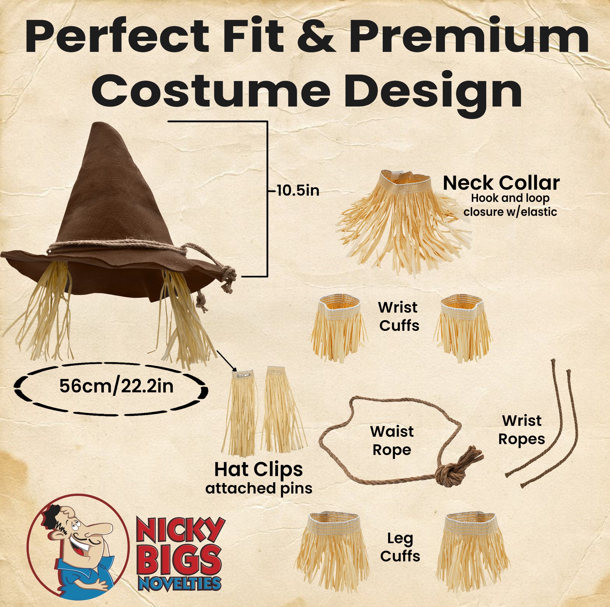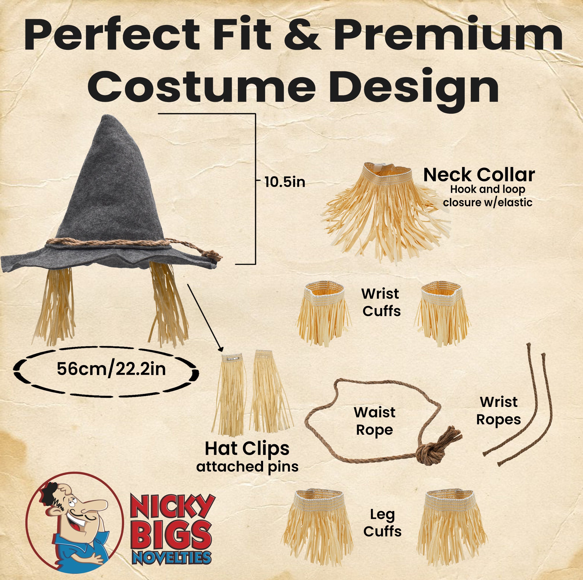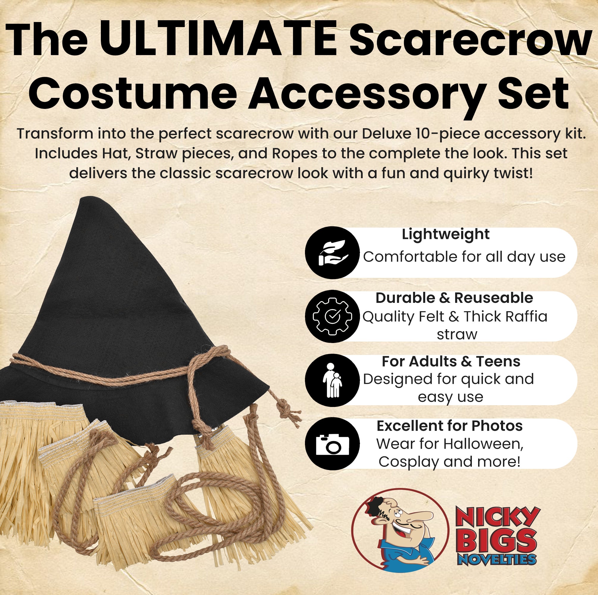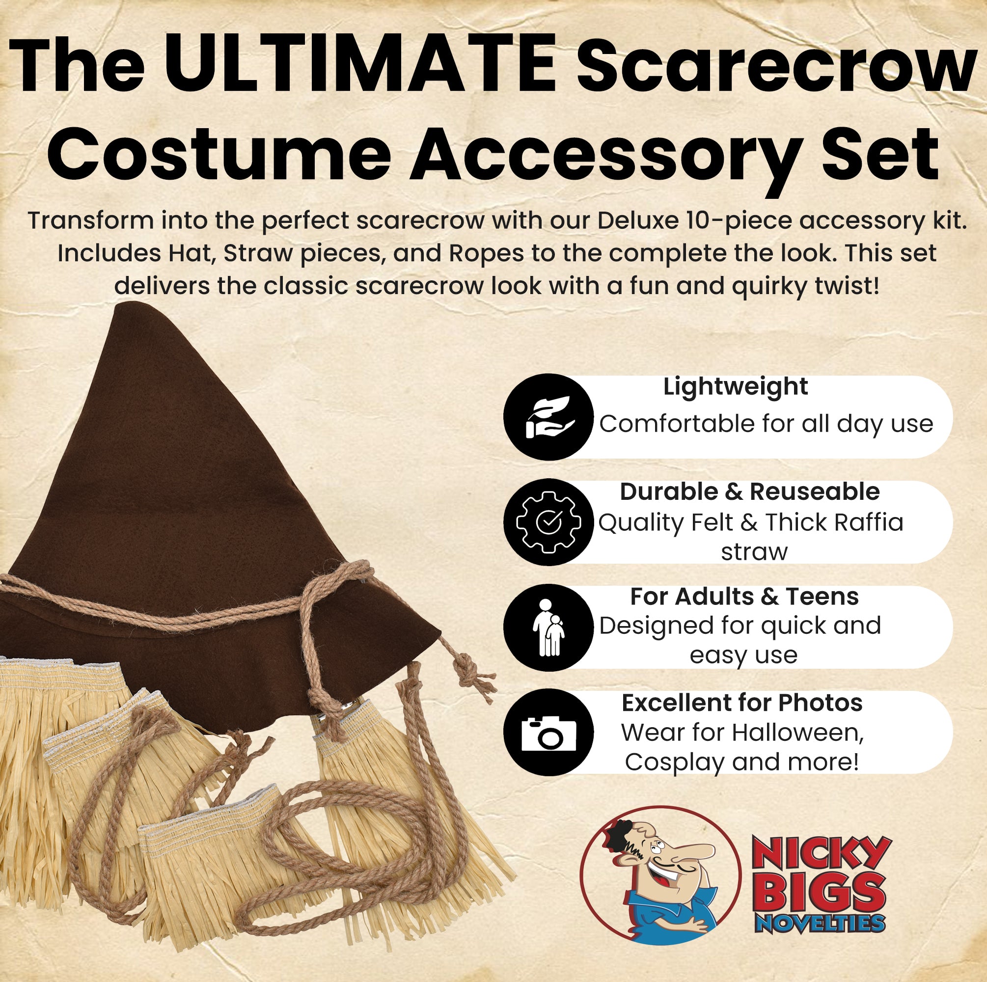 - CLASSIC SCARECROW LOOK Transform into the ideal scarecrow with this deluxe felt hat and 10-piece straw and rop to complete e scarecrow accessory kit. Whether for Halloween, fall festivals, or cosplay, this set brings an authentic farm-inspired touch to any costume. Ideal for looking festive while keeping crows (and people) entertained!