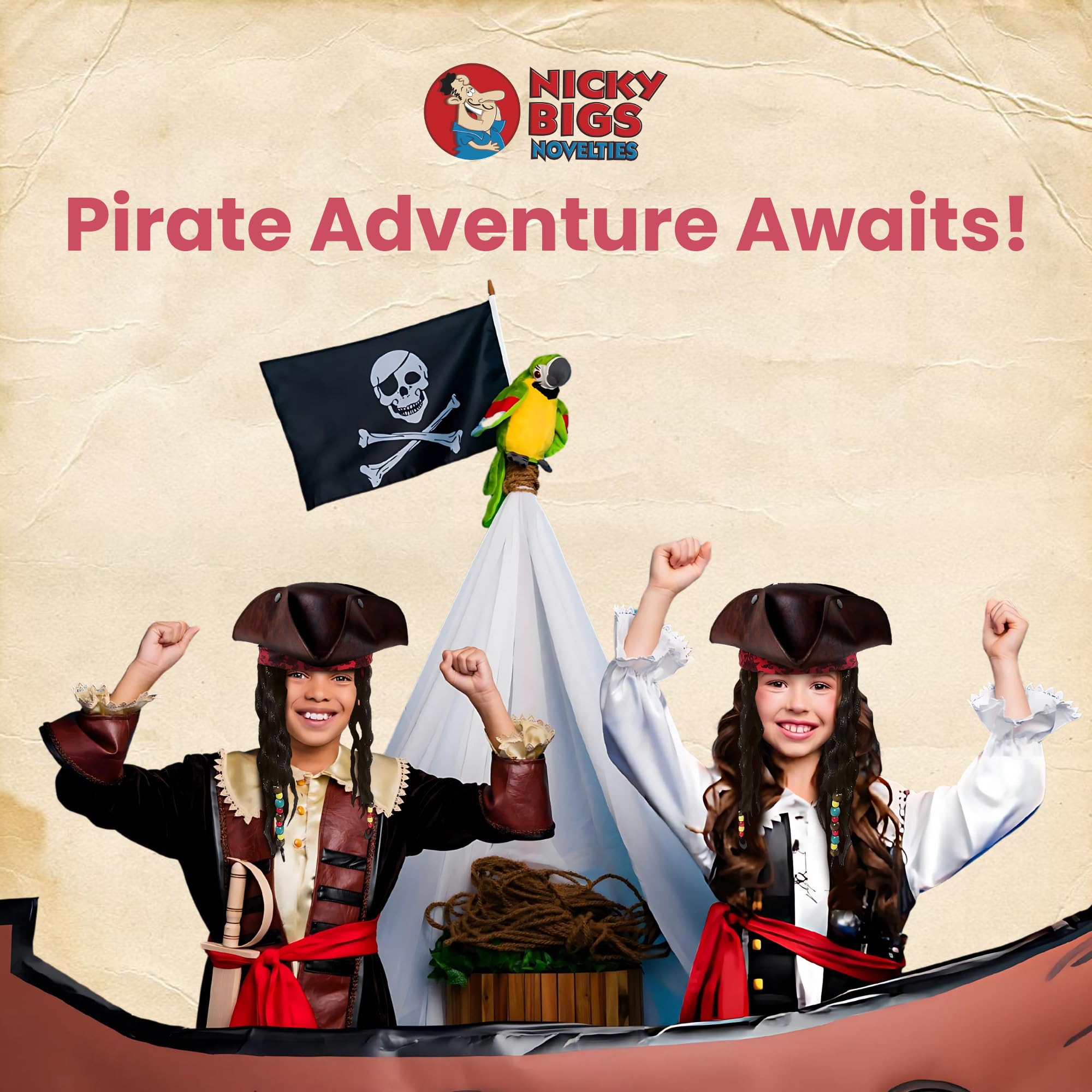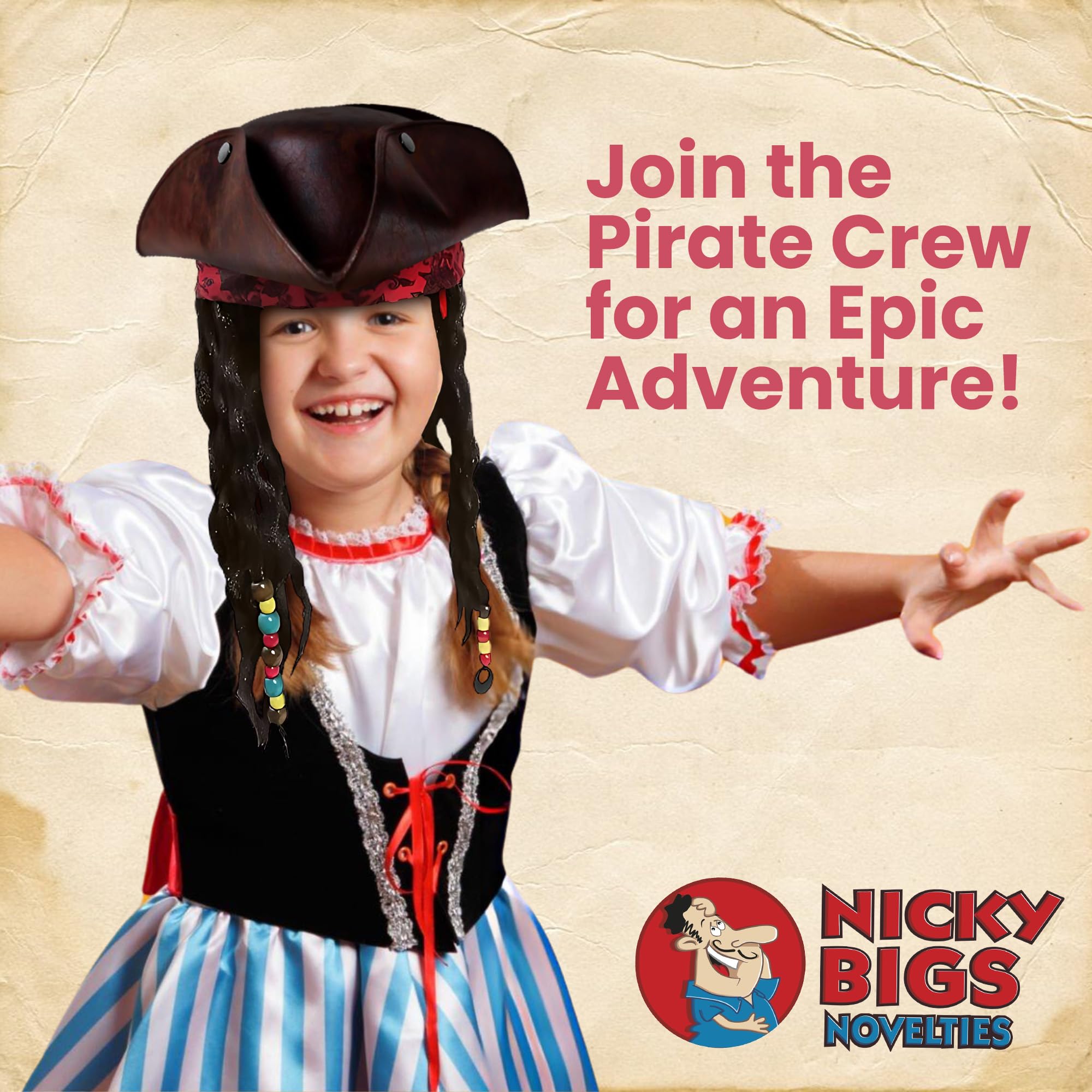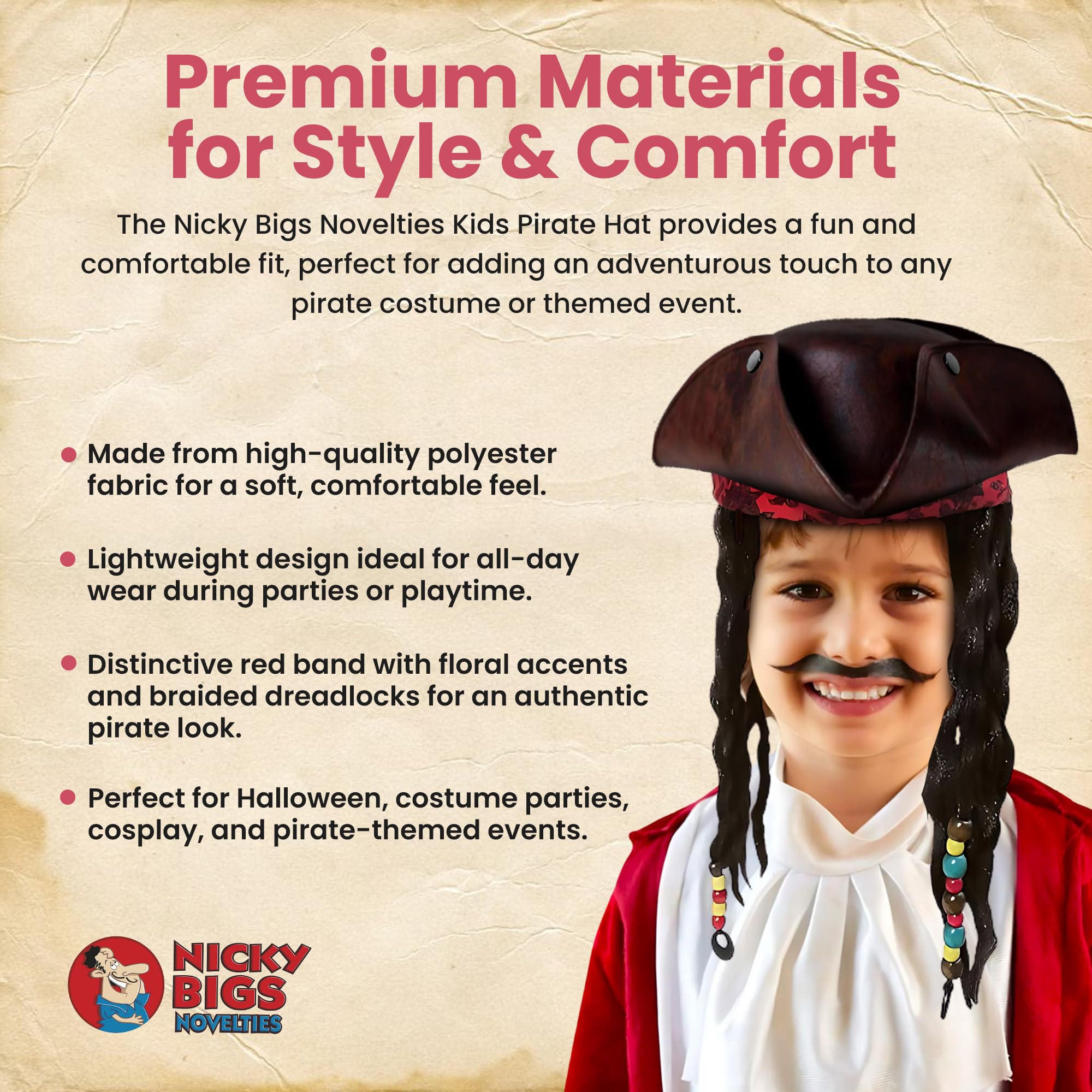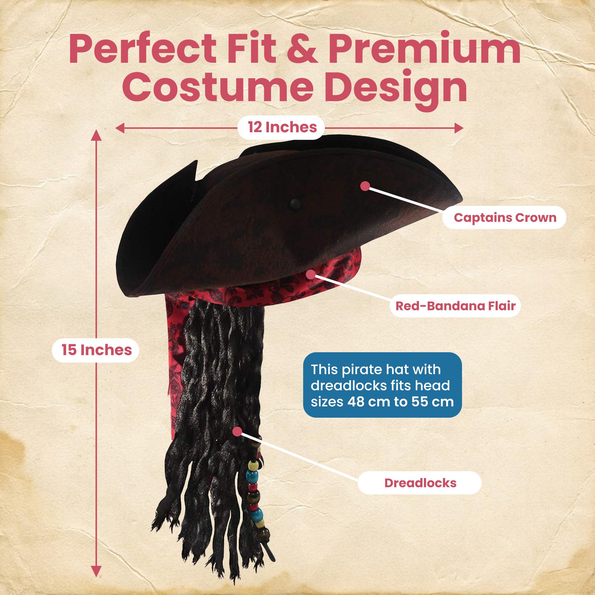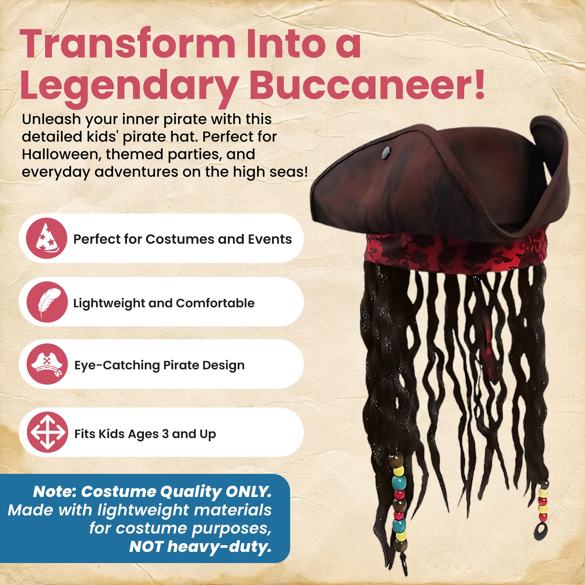 - DETAILS TO EMBODY YOUR FAVORITE PIRATE: Featuring a 4 inches tall and about 12 inches long and wide, this bold tricorn hat shape, braided faux hair, and a vibrant red band, this hat adds flair to any costume. A standout piece in pirate accessories, it helps kids channel their inner buccaneer with their favorite pirate costume kids.