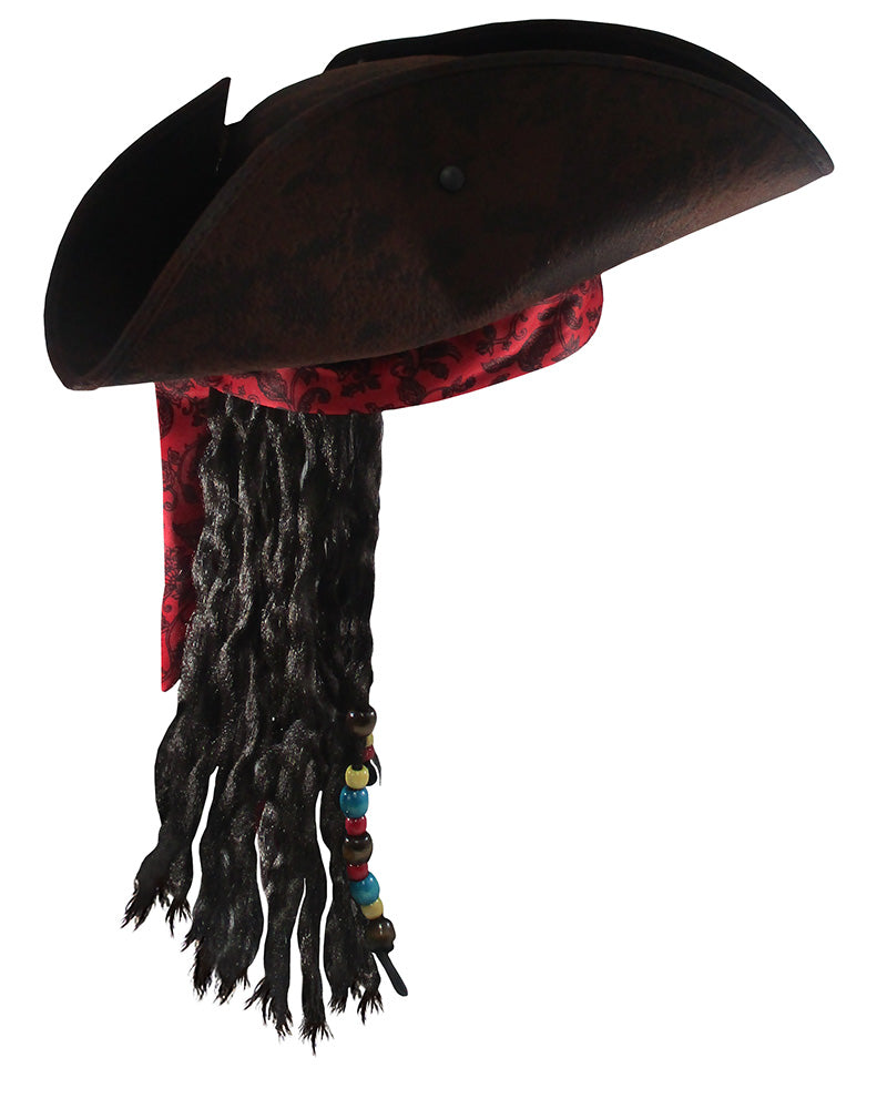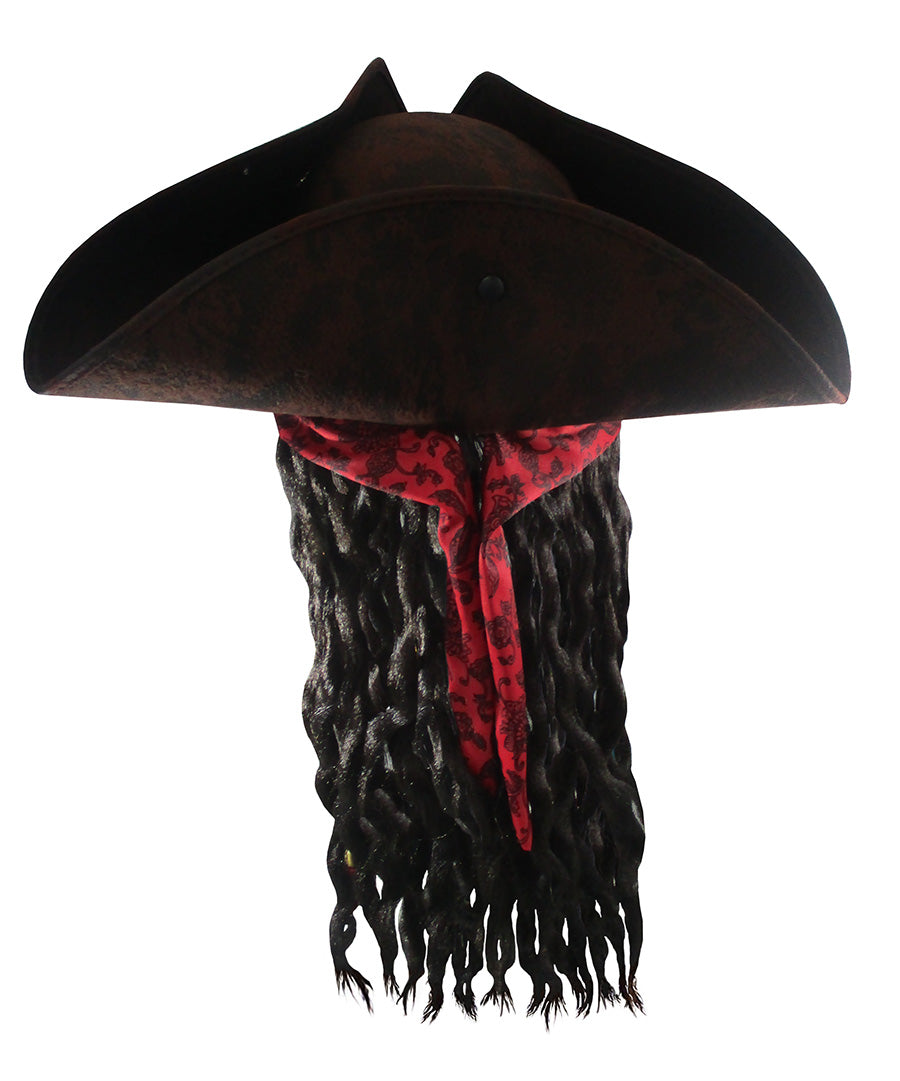 • Featuring a tri-corne hat with attached brown faux braided hair with beads accented by a red band with floral filigree.