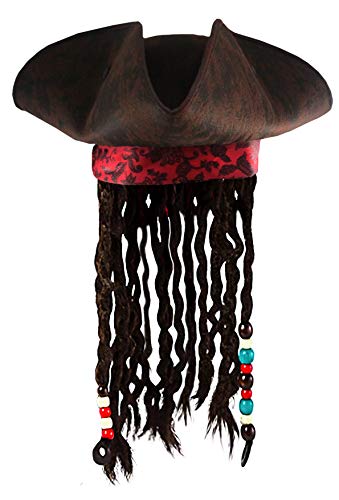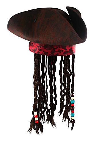 Complete your Pirate Costume this season with this Deluxe Child Caribbean Pirate Hat with Attached Dread Locs Wig. Perfect for Halloween, Cosplay, Theater and more! Featuring a tri-corne hat with attached brown faux braided hair with beads accented by a red band with floral filigree. Great for children of all ages! Tricorner hat has sweatband inside for a customized fit. Also included with the hat is a black satin fabric eye patch, and a gold clip on hoop earring. Fits approximately 48 cm to 55 cm. Dreads hang approximately 15 inches long. Cap stands approximately 4 inches tall and about 12 inches long and wide. Brim snaps into place to create the tricorn look. Spot clean only.