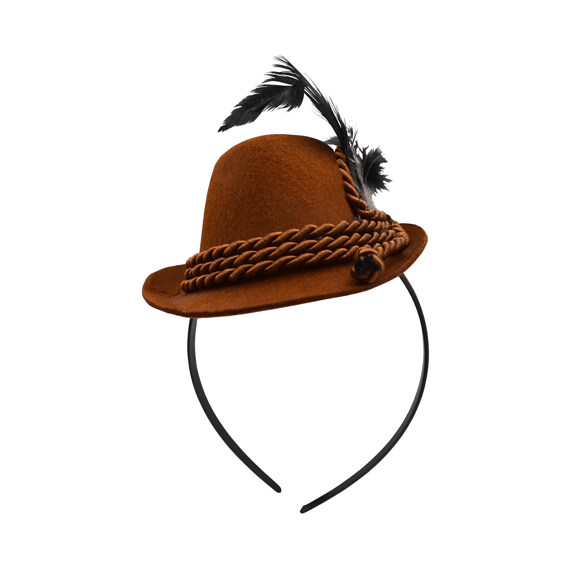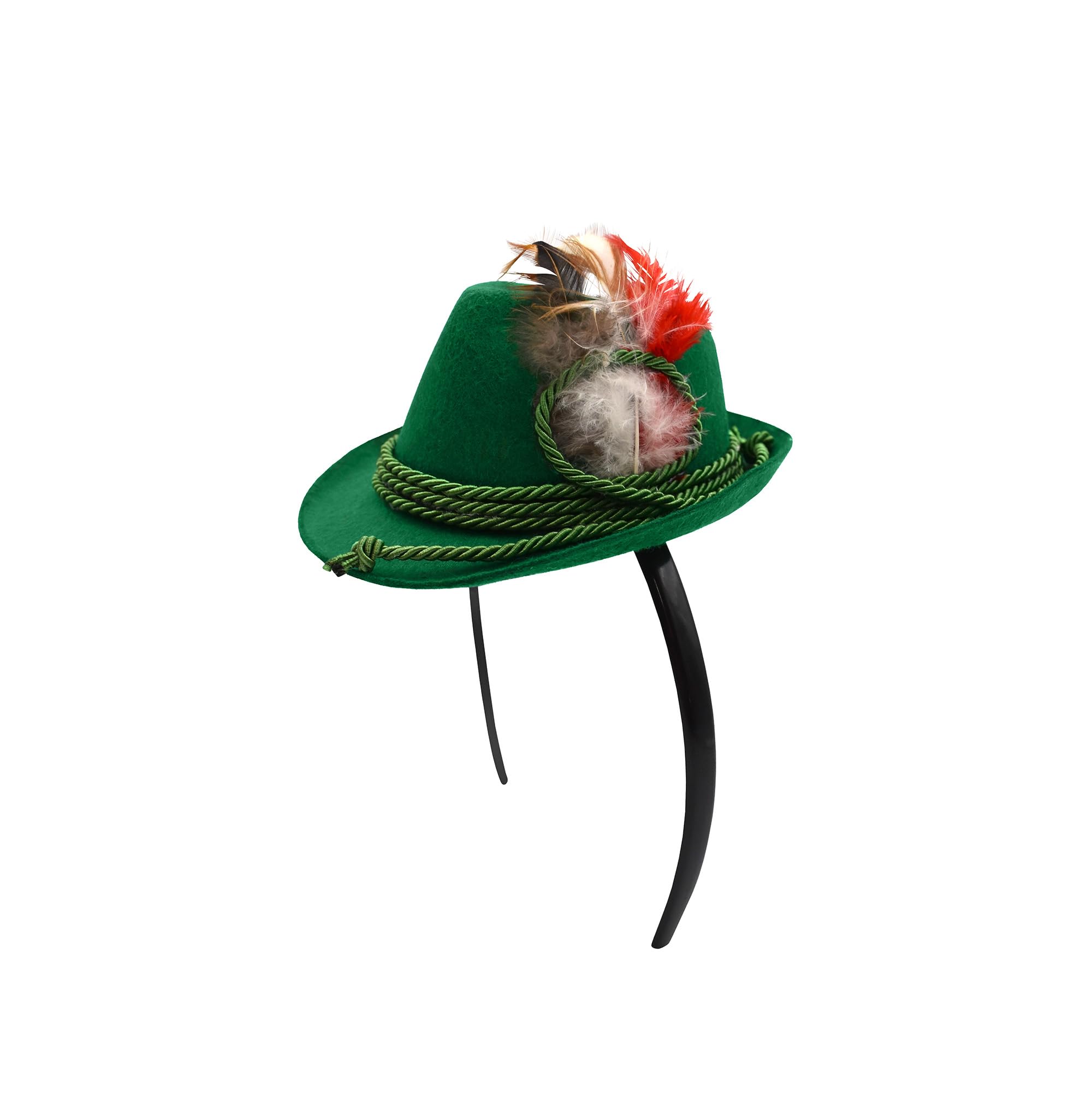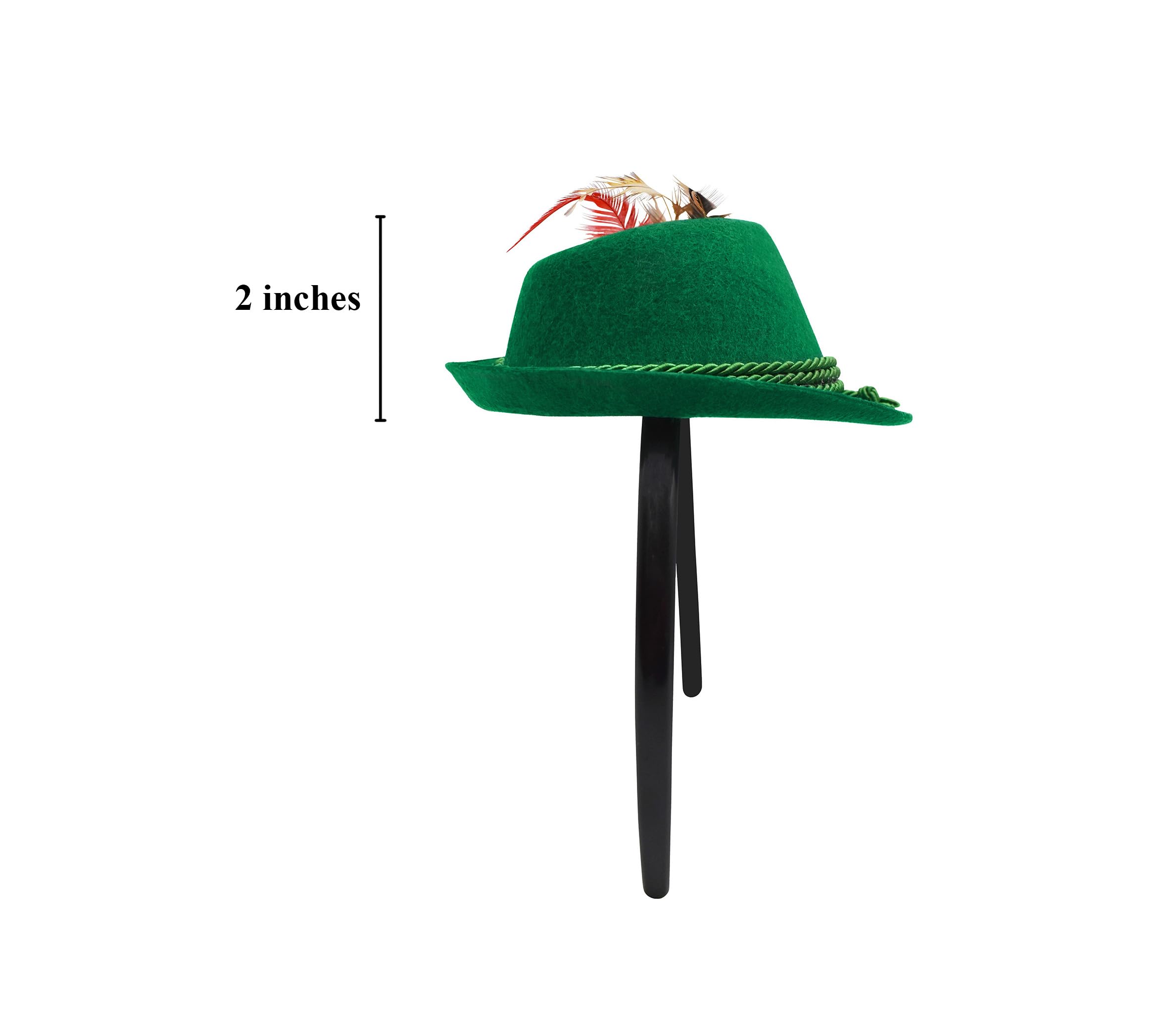- Mini Alpine Hat with Feather Trim: This deluxe mini fedora hat is made from lightweight pressed felt for a soft yet structured feel. Measuring about 2 inches tall and 5.5 inches long, it features a braided rope band and colorful feather accent, all attached to a flexible headband. Comfortable enough for all-day wear, it adds the perfect Bavarian touch to your festival outfit.