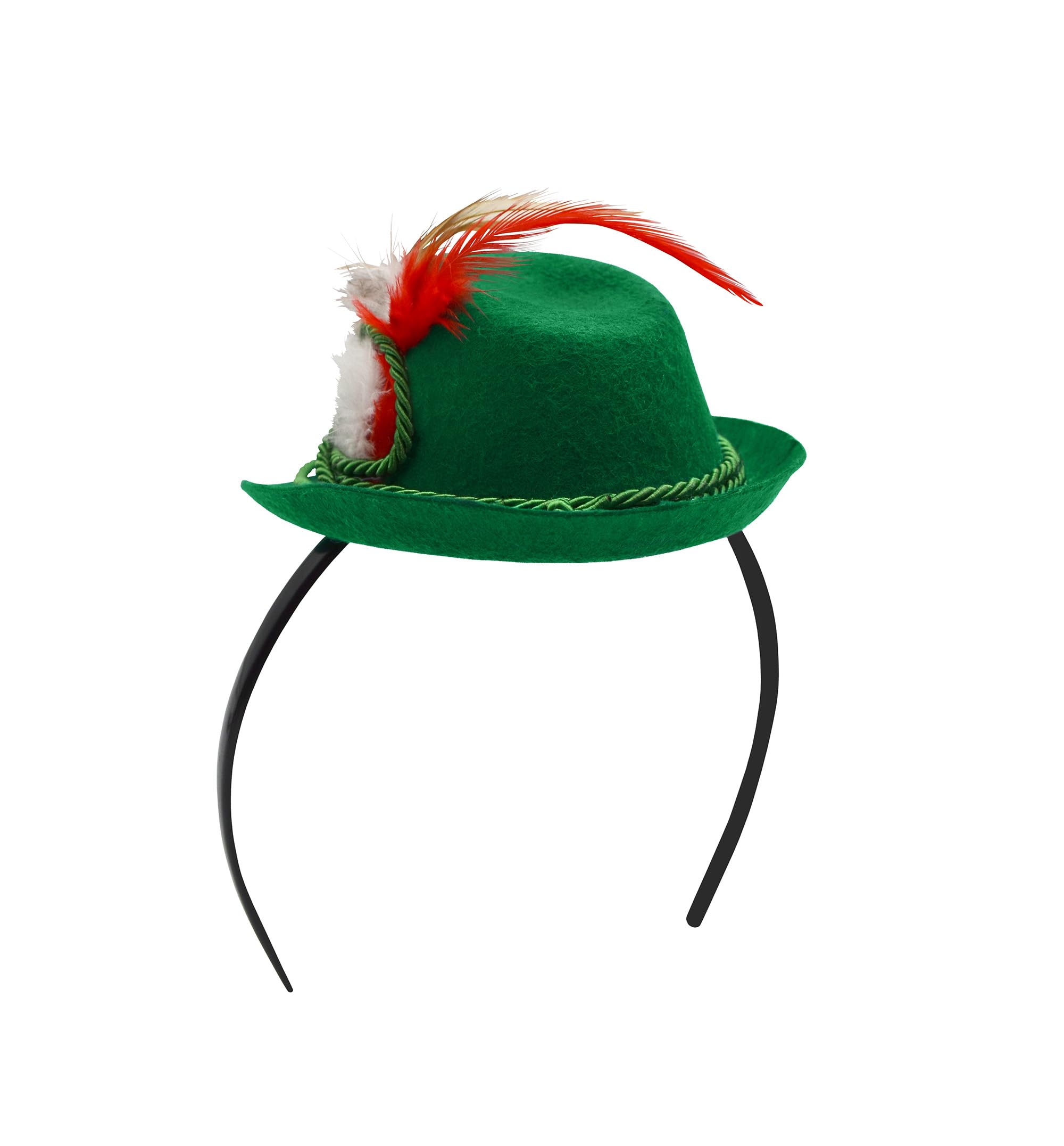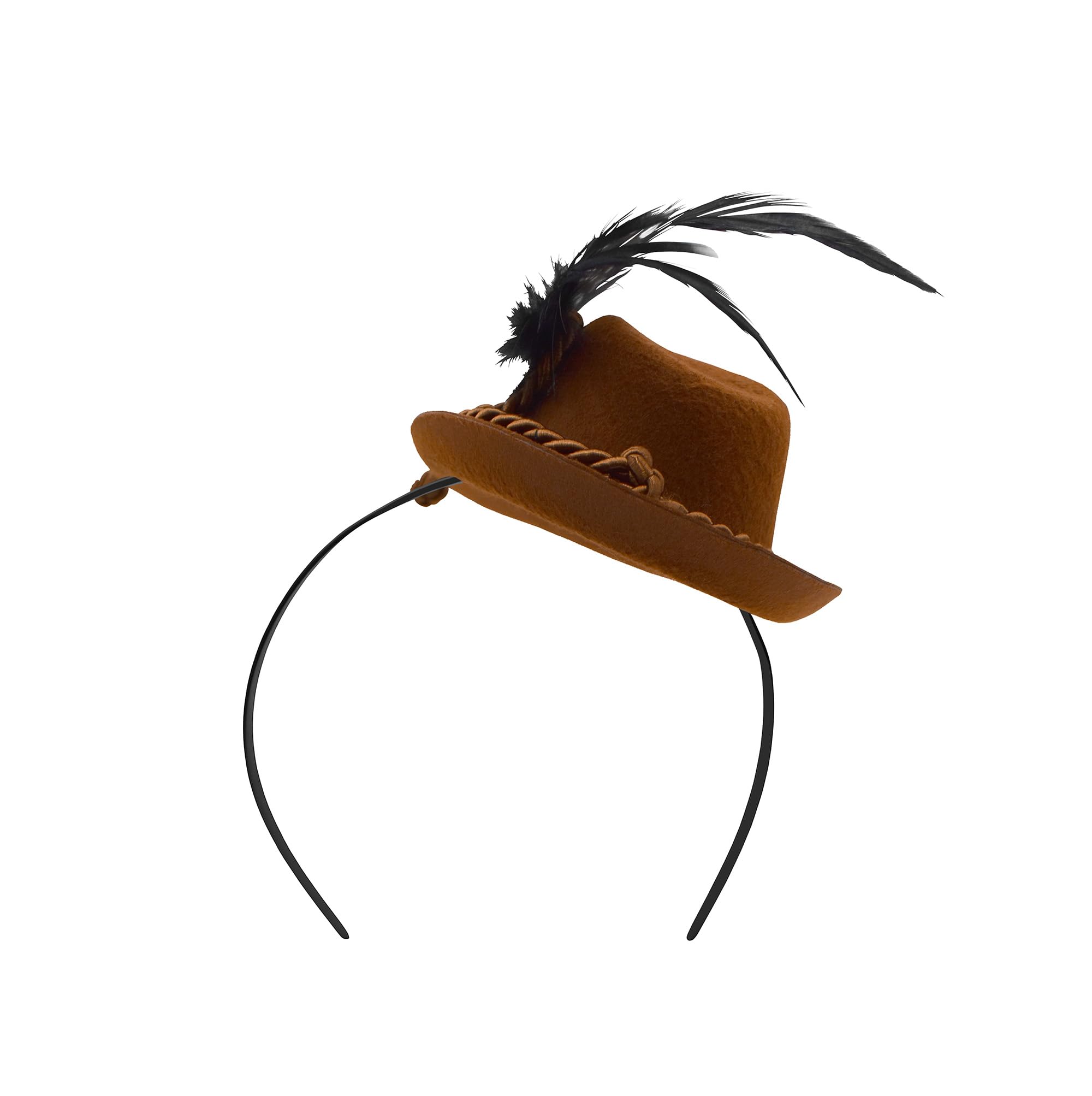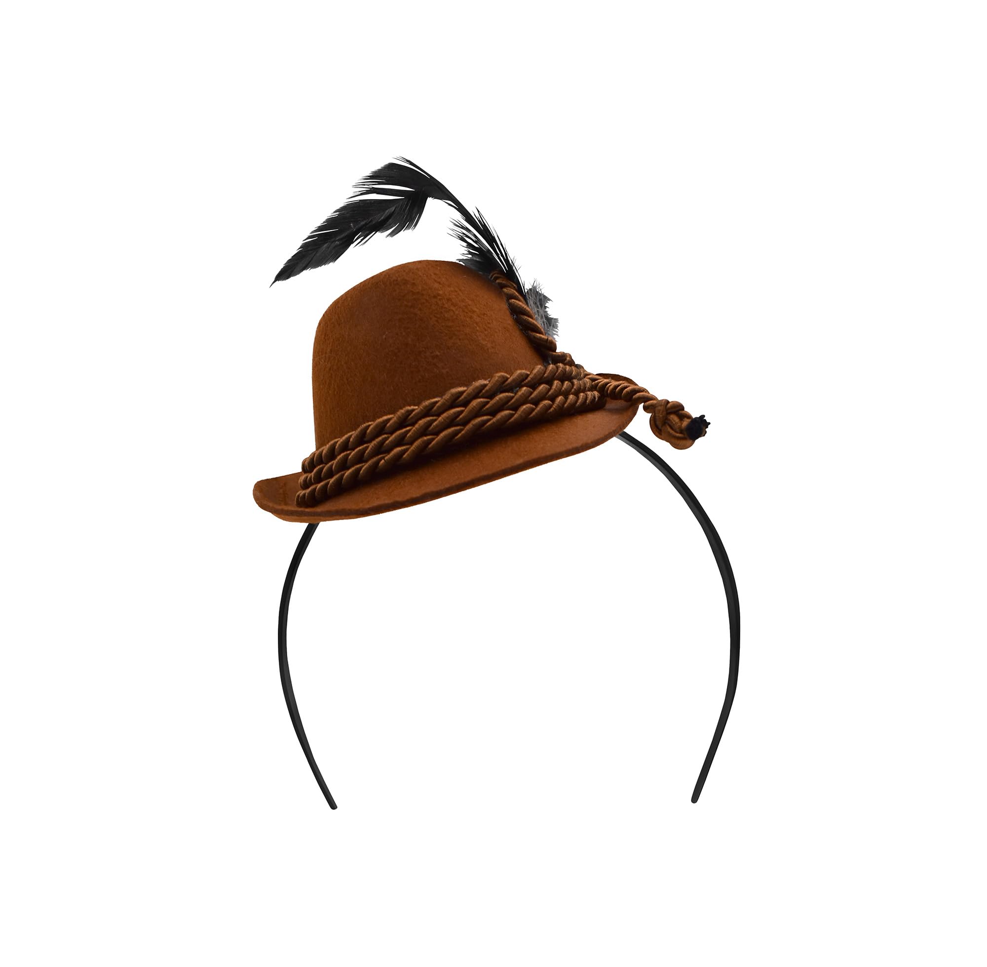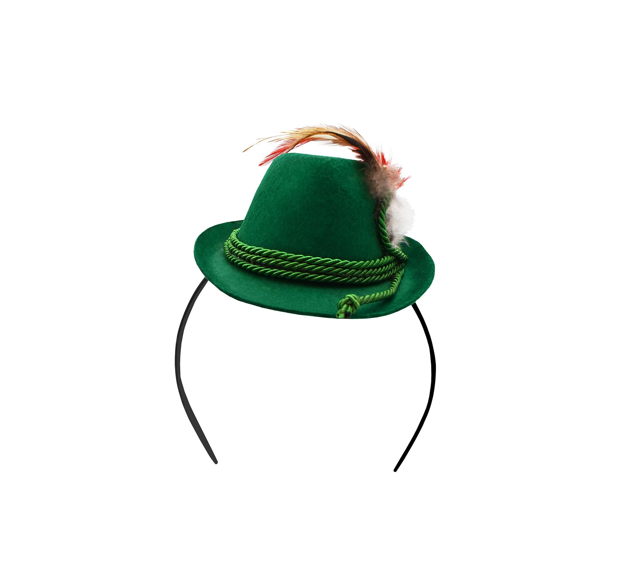 - Mini Alpine Hat with Feather Trim: This deluxe mini fedora hat is made from lightweight pressed felt for a soft yet structured feel. Measuring about 2 inches tall and 5.5 inches long, it features a braided rope band and colorful feather accent, all attached to a flexible headband. Comfortable enough for all-day wear, it adds the perfect Bavarian touch to your festival outfit.