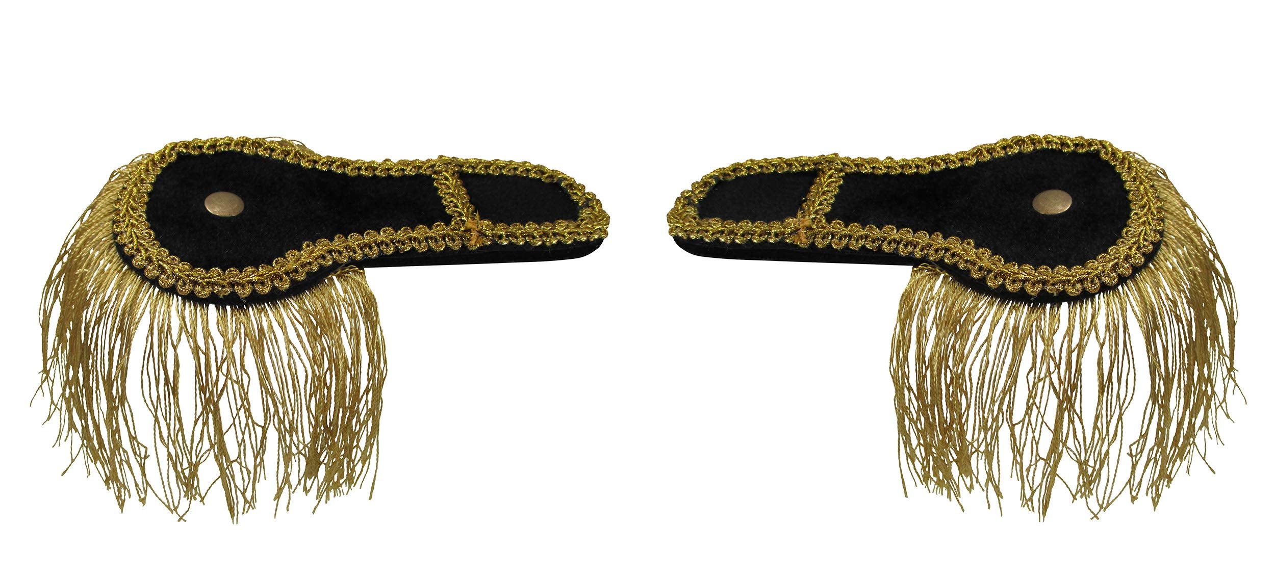 This set also includes a pair of plush black velvet shoulder epaulettes, trimmed with gold braid and finished with shiny gold fringe and faux buttons. At approximately 6 inches in length, with 3-inch hanging fringe, they attach easily and securely with included pins, making them ideal for performers on the move.