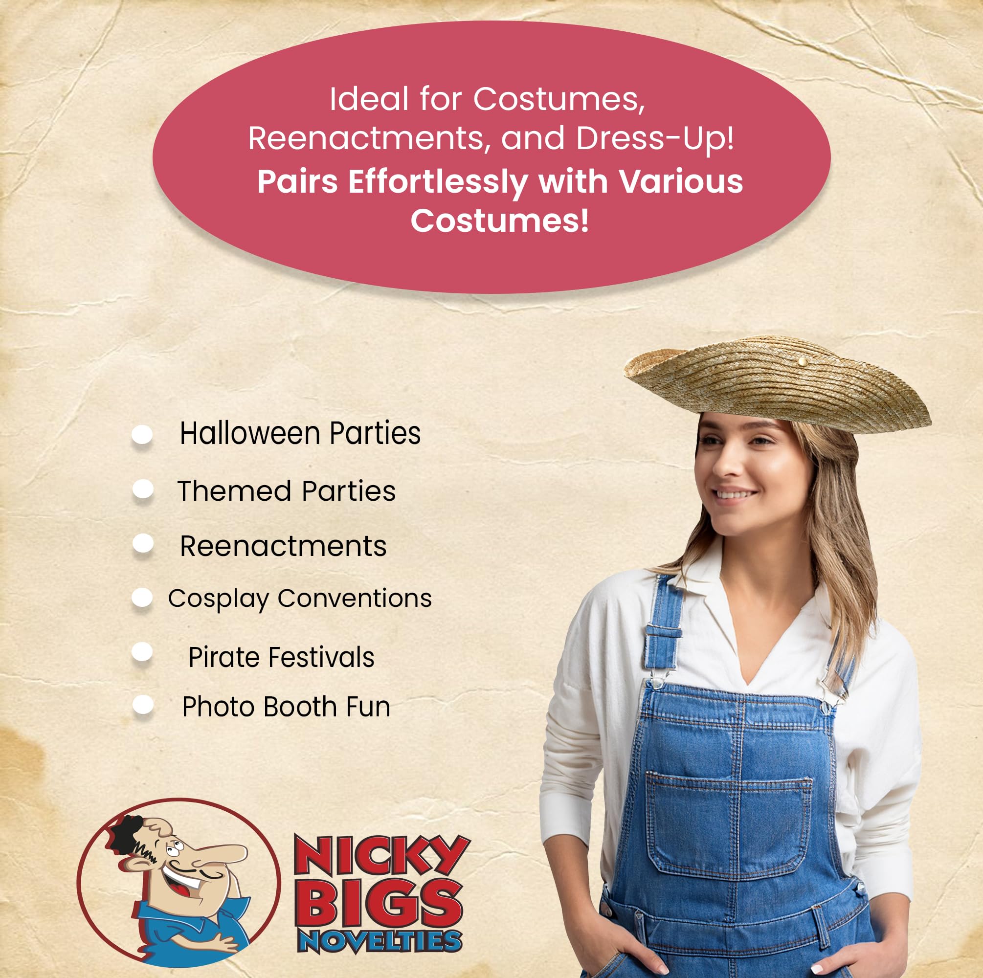 Nicky Bigs Novelties Adult Straw Colonial Tricorn Pirate Hat 3 Cornered Cocked Cap For Cosplay Halloween Costume Accessory