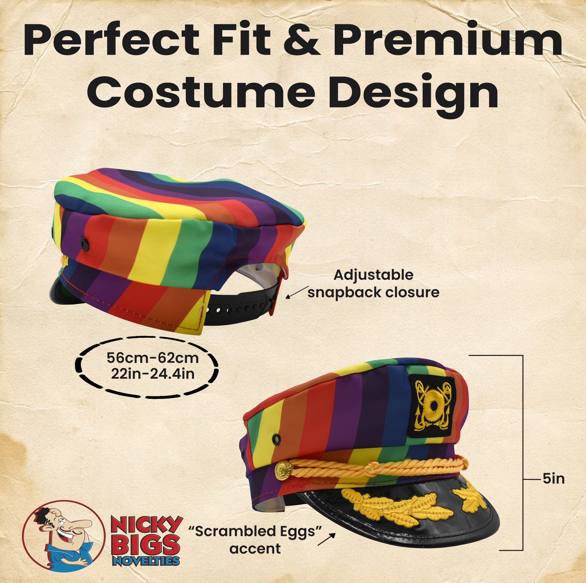 Rainbow Nautical Design: Navy cap adorned with vibrant rainbow panels, gold anchor emblem, and traditional âscrambled eggsâ embroideryâideal for Pride, boat events, and cosplay. Adjustable Snapback: One-size-fits-most with adjustable snapback closure for head sizes 56â62âcm; ensures a snug, comfortable fit for teens and adults. Quality Materials: Constructed of durable polyester with a firm vinyl visorâlightweight, breathable, and spot-clean only for easy care. Use & Occasion: Whether you're cruising the high seas, celebrating Pride, dancing at summer festivals, or adding flair to Halloween and cosplay, this captainâs hat elevates any lookâday or night. Fit & Comfort: Designed for maximum comfort with structured build and snapback adjustabilityâperfect for long-lasting wear at events, parties, and voyages alike. Proudly made by Nicky Bigs Novelties, a USA-owned label powered by Marsinos Costumes, which carries over 100 years of service.