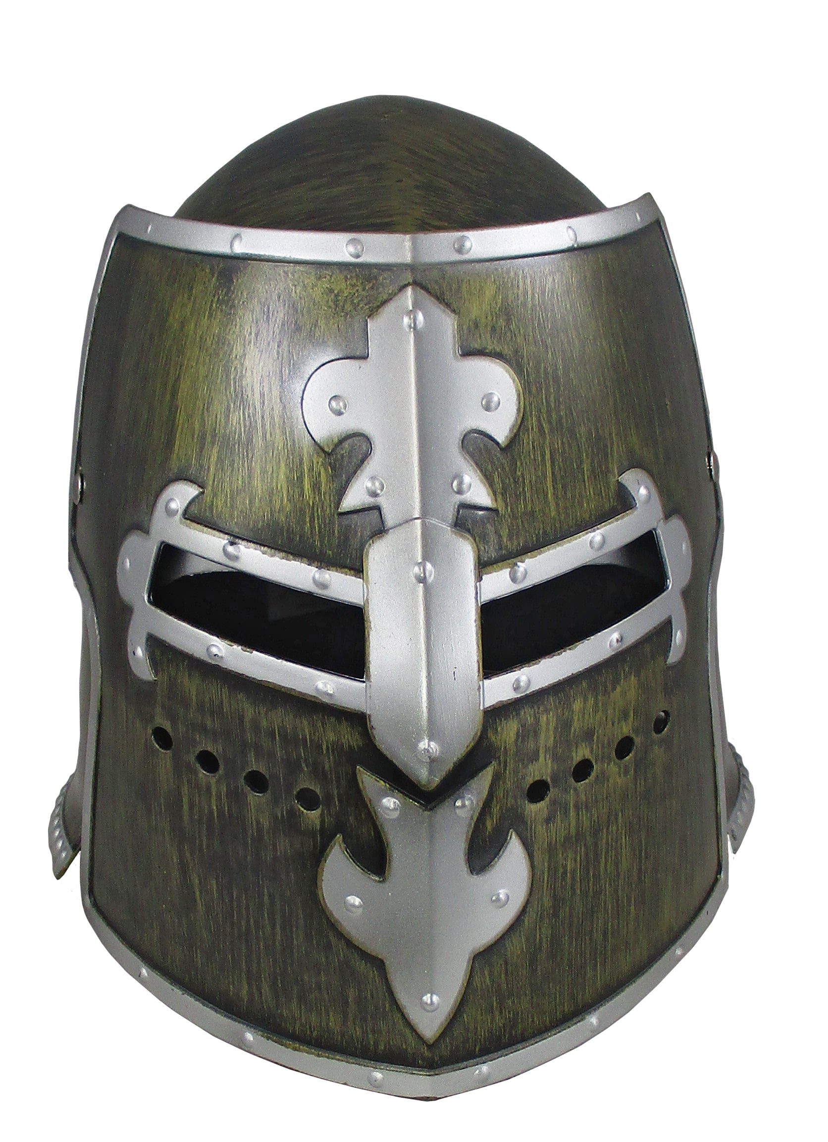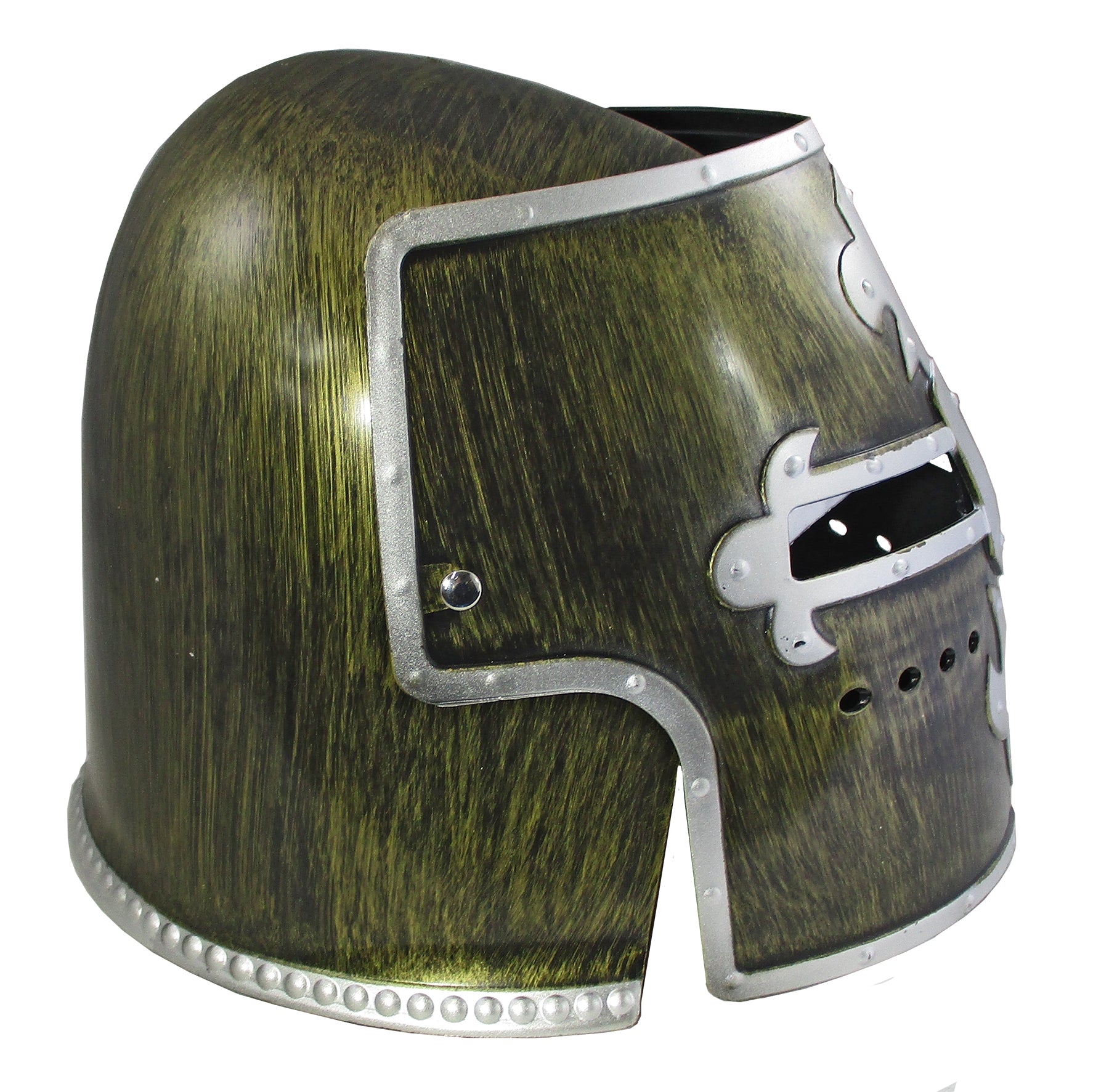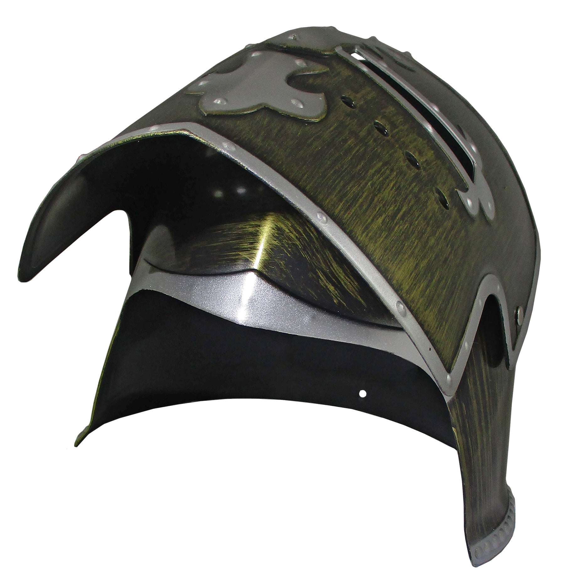 Pewter Medieval Knight Helmet by Nicky Bigs Novelties Thick Plastic Medieval Knight Helmet with Folding Face Mask Front. Adhesive foam strips or gluing foam strips on the inside can help for comfort and adjusting the size to fit smaller heads. Outside Measurements are Approximately 9" W, 9"H, 10"D. The great helm or heaume, also called pot helm, bucket helm and barrel helm, is a helmet of the High Middle Ages which arose in the late twelfth century in the context of the Crusades and remained in use until the fourteenth century. They were used by knights and heavy infantry in most European armies between about 1220 to 1540 AD.In its simplest form, the great helm was a flat-topped cylinder of steel that completely covered the head and had only very small openings for the eyes and mouth. Later designs gained more of a curved design, particularly on the top, to deflect or lessen the impact of blows. Helmets may have slight scratches and paint splotches due handling and hand painting. For Ages 14 and Older. Chose between silver or gold or black.