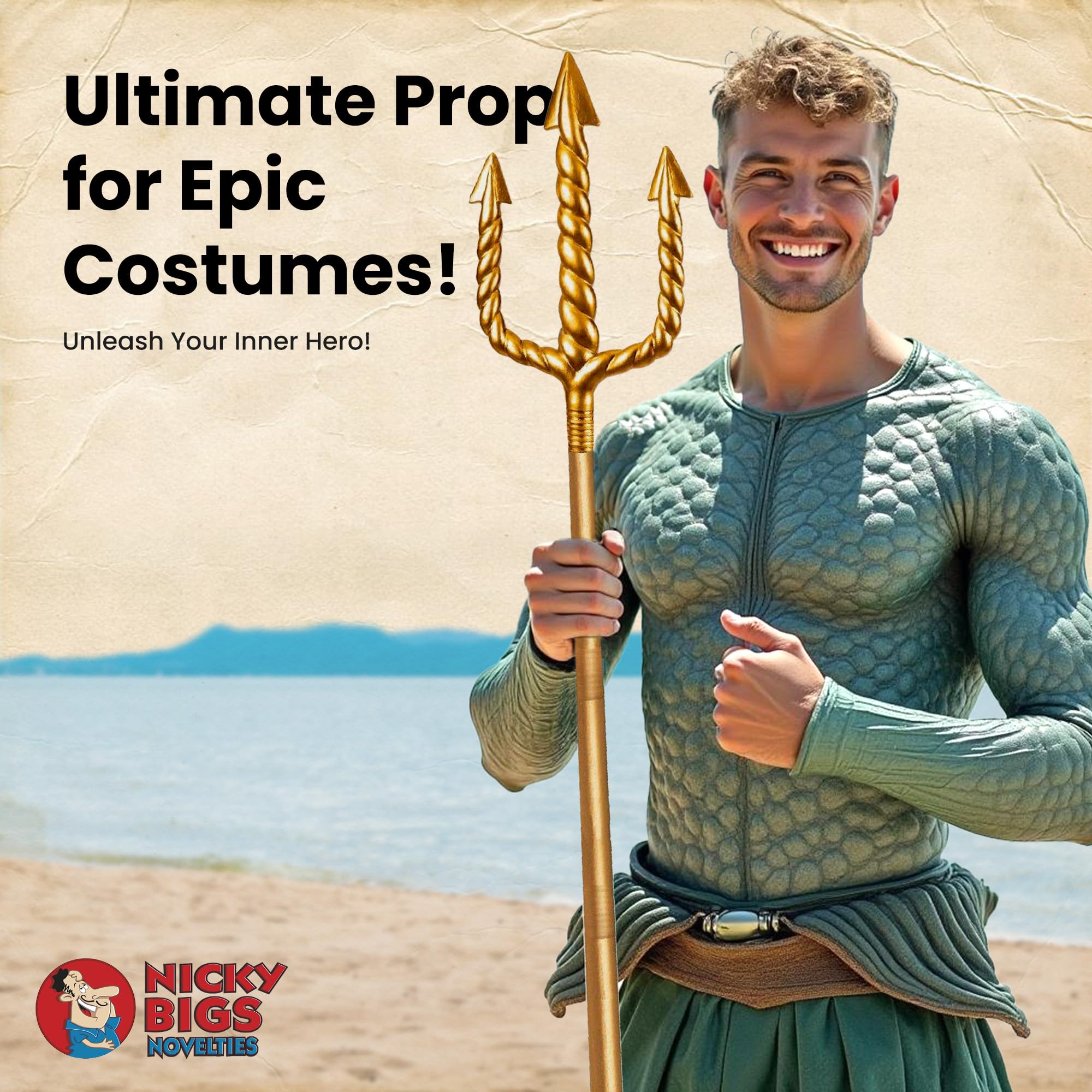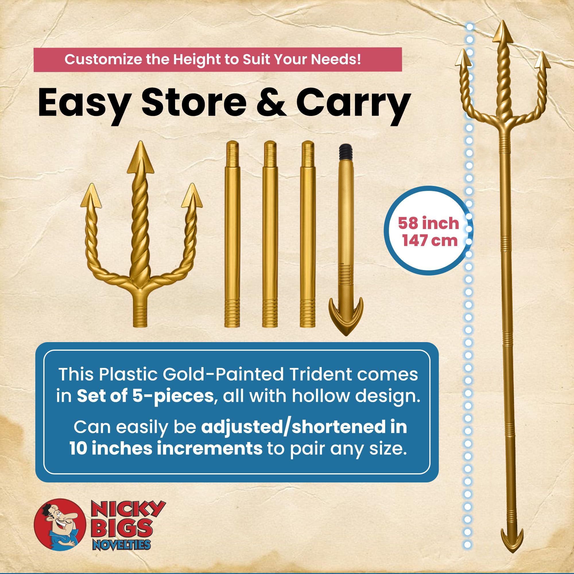 Step into the realm of oceanic legends and mythical kings with the Poseidon costume accessory the Nicky Bigs Novelties King Triton Plastic Pitchfork. Ideal for elevating your King Triton costume, Neptune costume, or even an inspired look, this striking trident captures the regal power and commanding presence of the seas iconic rulers. Crafted from lightweight, durable plastic, this 5-piece trident measures approximately 4'5" tall and features detailed textured handles and intricately designed prongs, giving it an authentic, majestic appearance. Its hollow, adjustable design ensures a comfortable grip and customizable height for both adults and teens, making it suitable for cosplay, Halloween parties, theatrical performances, or themed events. Whether youre embodying the mighty Poseidon, the legendary King Triton, or the heroic wielding his powerful trident, this versatile prop transforms your costume with ease. Its also great for any Neptune costume requiring a bold, oceanic pitchfork that stands out from the crowd. Easy to assemble and disassemble, this trident is built for convenience and repeated use. While its designed as a costume accessory rather than a functional tool, its impressive craftsmanship and iconic design make it a must-have for anyone wanting to channel the strength and majesty of the seas kings. Bring your mythical character to life with this King Triton plastic pitchfork and rule your next event with style and confidence!
