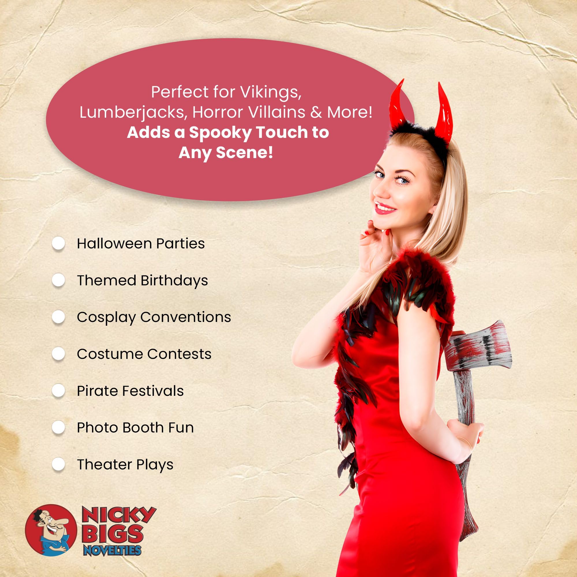 - VERSATILE USE FOR ANY OCCASION Whether youre dressing up as a fearsome warrior, a haunted woodsman, or a horror movie villain, this axe prop completes your look. Ideal for Halloween, cosplay events, LARP, horror-themed parties, theatrical productions, and scary pranks!
