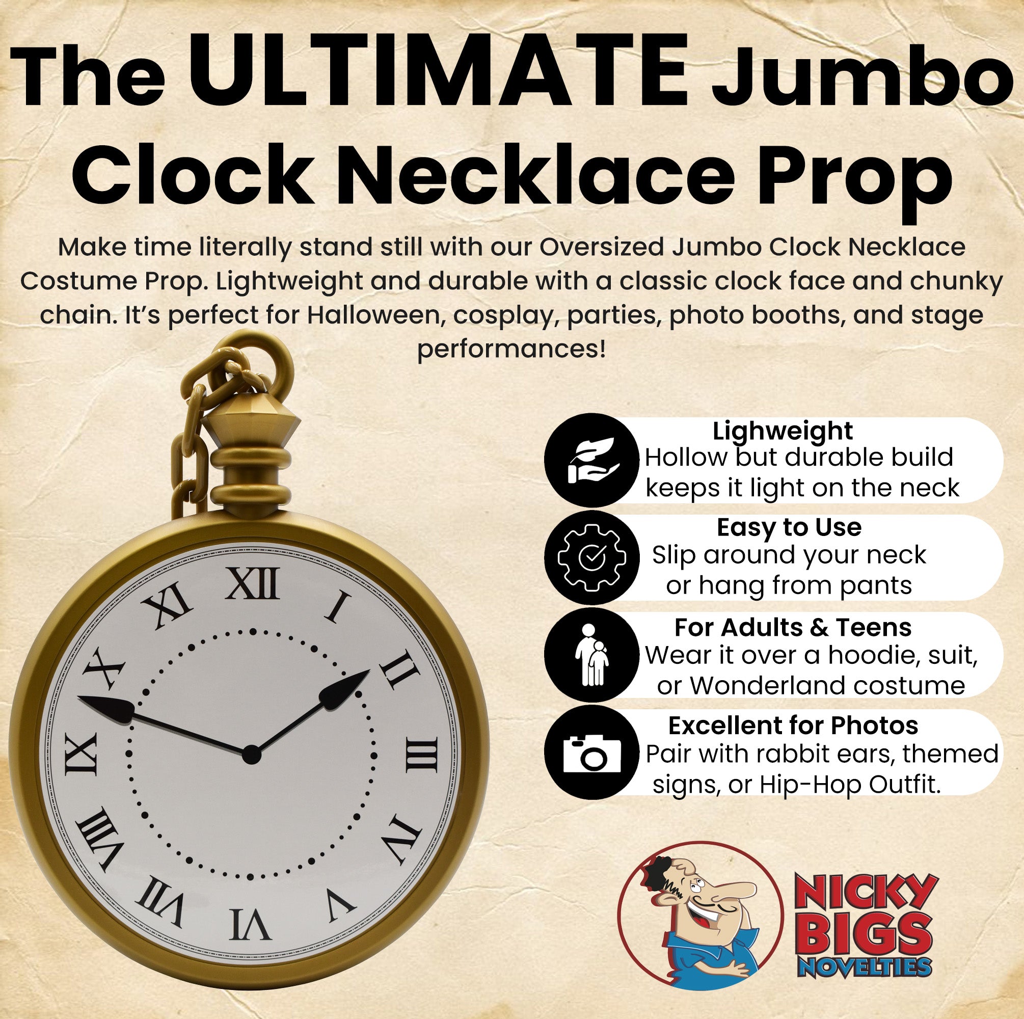 Jumbo Clock Necklace Prop 10″ Oversized Clock Chain Halloween Costume Accessory