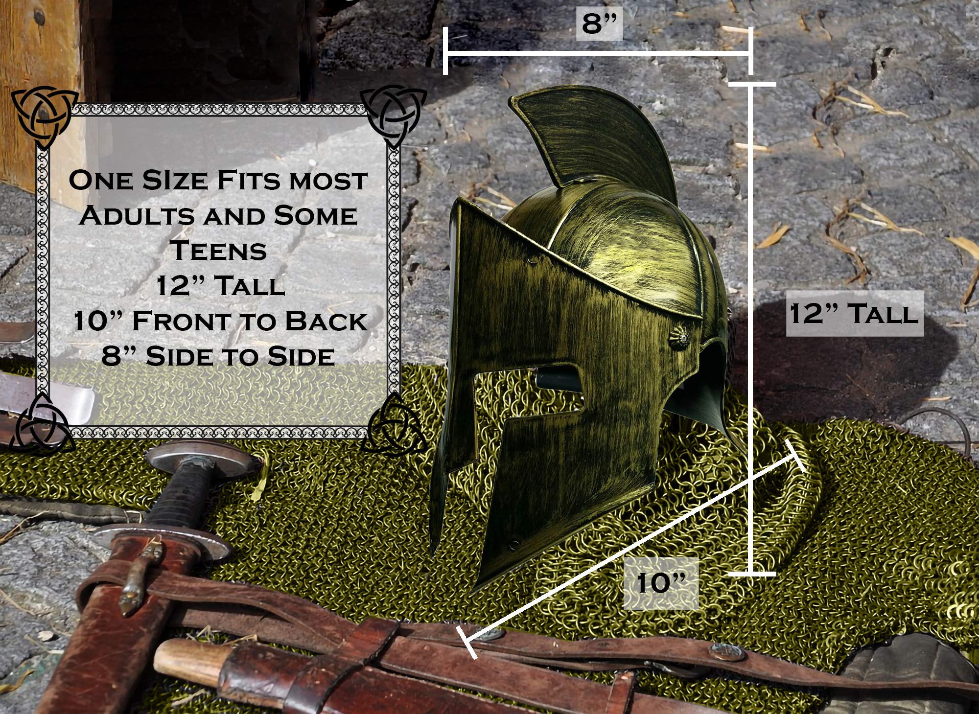 Helmet: Reminiscent of the Chalcidian type Helmet. This plastic replica can be worn or displayed. Make sure you have the perfect fit to ensure your safety during your pretend battles. Measuring 12" tall, 10" from front to back and 8" from side to side. One size fits most adults and some teens. Add your own foam strips on the inside for a more comfortable and secure fit. Great for Larping, cosplaying, school plays, Halloween, as a decorative piece, and more. Perfect for Greek Solider.