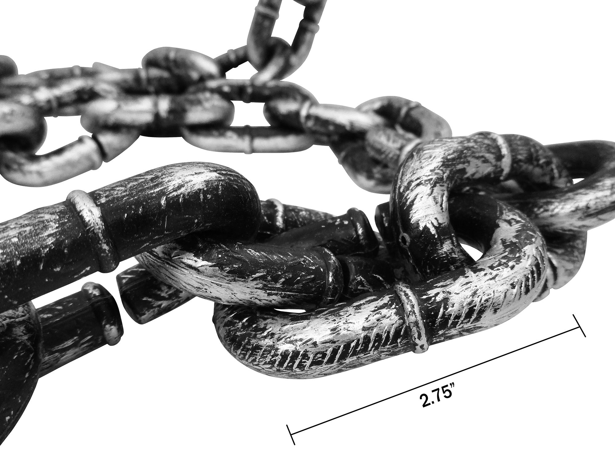 Get ready to bring the Horror to life with this Deluxe Prop. Featuring curved meat hooks on either side of an attached fake chain. The chain prop is black with silver paint to give a rusty authentic look. Each hook features a bloody tip for a more haunted appearance. With a total length of 90.5 inches long, each hook is 13.5 inches long including the loop. The chain is about 64 inches long, perfect to use as garland or as a costume weapon. This Halloween decor is made of durable hollow plastic, use as a wall hanging or a tabletop decoration. Each link is about 2.75 inches long and features a realistic metal look. From making your own scary movie to throwing a smashing Halloween party, this prop can do it all! Great for Haunted Butchers, Scary Clown, Psycho Killers Costumes and more! *Prop is not meant for any real world use and Can't hold heavy items. For ages 14 and older