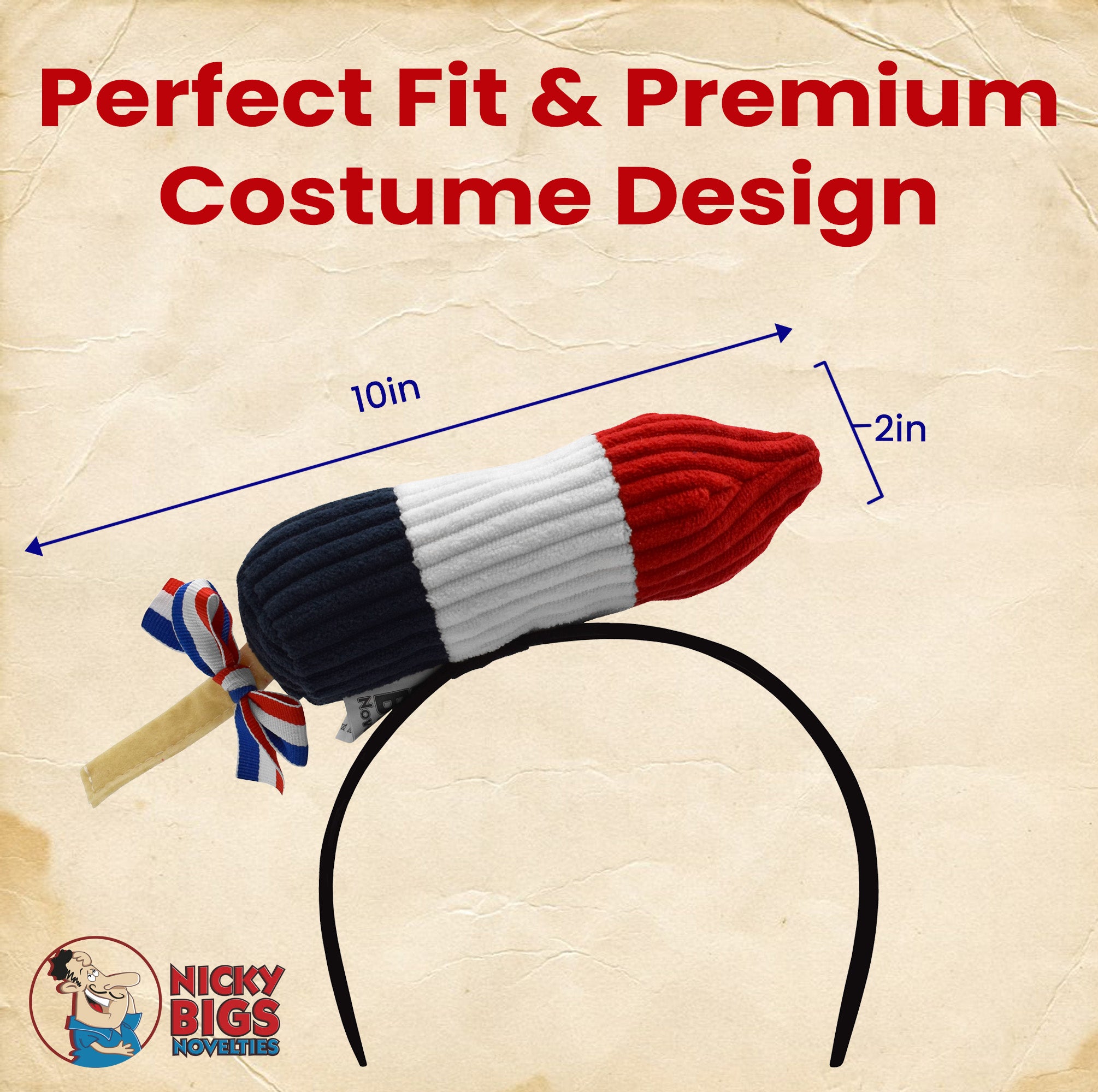 Show off your star-spangled spirit with the Nicky Bigs Novelties Patriotic Rocket Popsicle Headband—a quirky and comfortable accessory designed for everyone who loves to celebrate the red, white, and blue in style. This standout piece features a plush felt rocket popsicle designed in classic Americana colors, accented with a decorative bow and perched atop a lightweight headband for easy wearability.