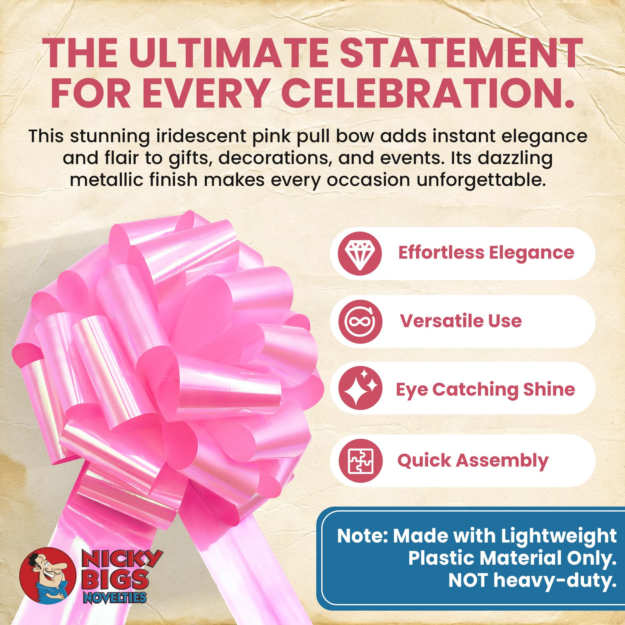 Add a touch of elegance to your gifts with the Nicky Bigs Novelties 14 Inch Pink Iridescent Metallic Ribbon Pull Bow. Perfect for large presents and special occasions, this convenient pull string design makes gift wrapping a breeze. The dazzling iridescent finish adds sophistication, ensuring your gifts stand out. Elevate your presentation with this stunning pink bow.Gender Reveal Bows! Includes one 14'' SINGLE Instant Bow, Iridescent Metallic, Great use for Birthdays, Weddings, Engagements and more AGES 14+