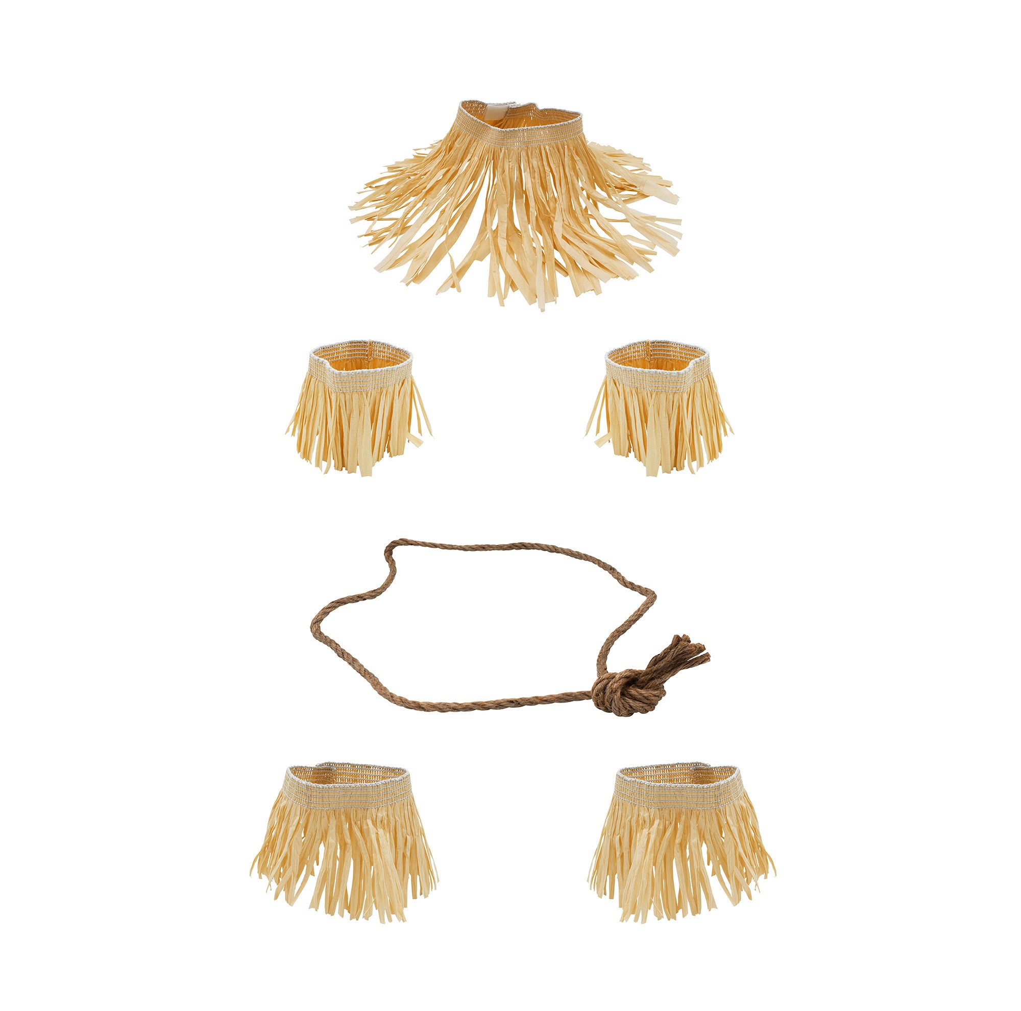 • 11 PIECE COMPLETE SCARECROW KIT Includes a burlap sack scarecrow hat with optional 2 piece pin on straw hat accessories, a neck straw piece, two wrist cuffs and two wrist ropes, and two ankle cuffs with a rope belt to tie it all together. Achieve that classic farmhouse look with a set thats easy to wear, fun to style, and bound to get compliments!