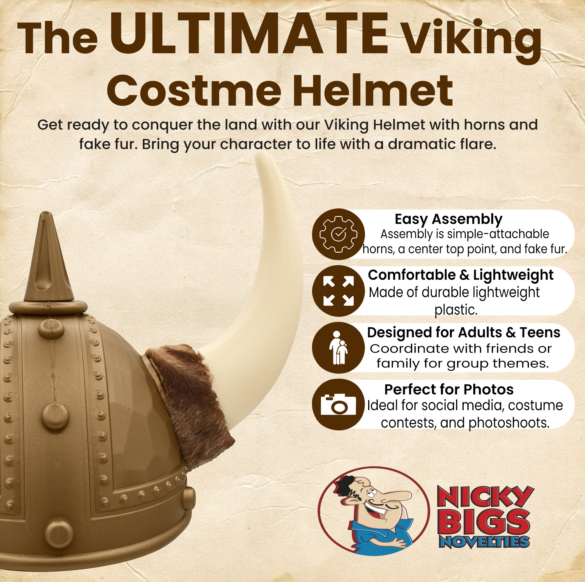 - Authentic Viking Look: Unleash your inner Norse warrior with Nicky Bigs Novelties’ Viking Helmet, featuring off-white hollow horns with brown faux fur accents. The helmet’s gold-tone plastic body delivers a striking medieval appearance, perfect for adding dramatic flair to Halloween, cosplay, or stage costumes.