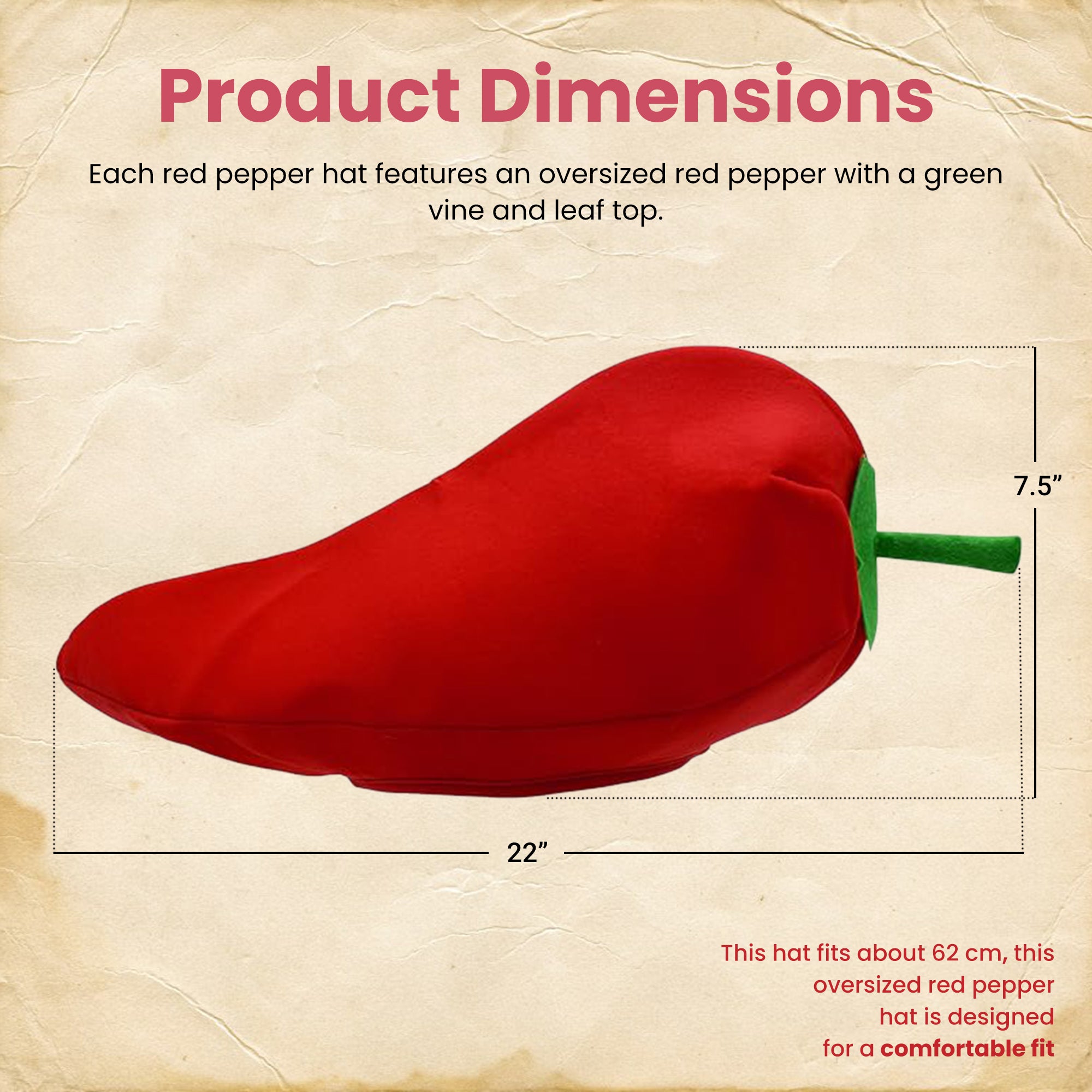 - Oversized chili pepper is about 22 inches long, including stem. This fun hat stands about 7.5 inches tall at the tallest point and fits about 62 cm.