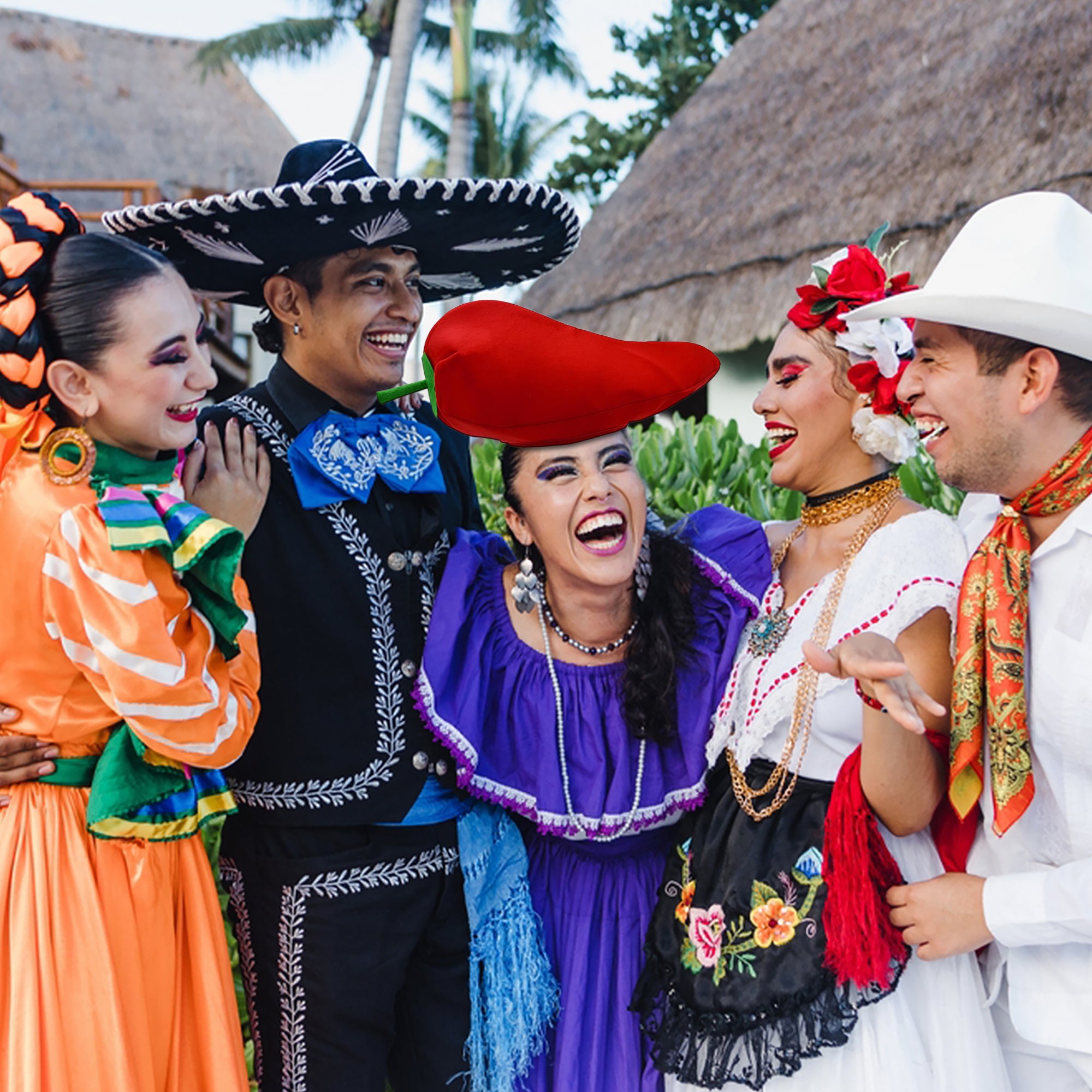 - Each red pepper hat features an oversized red pepper with a green vine and leaf top.