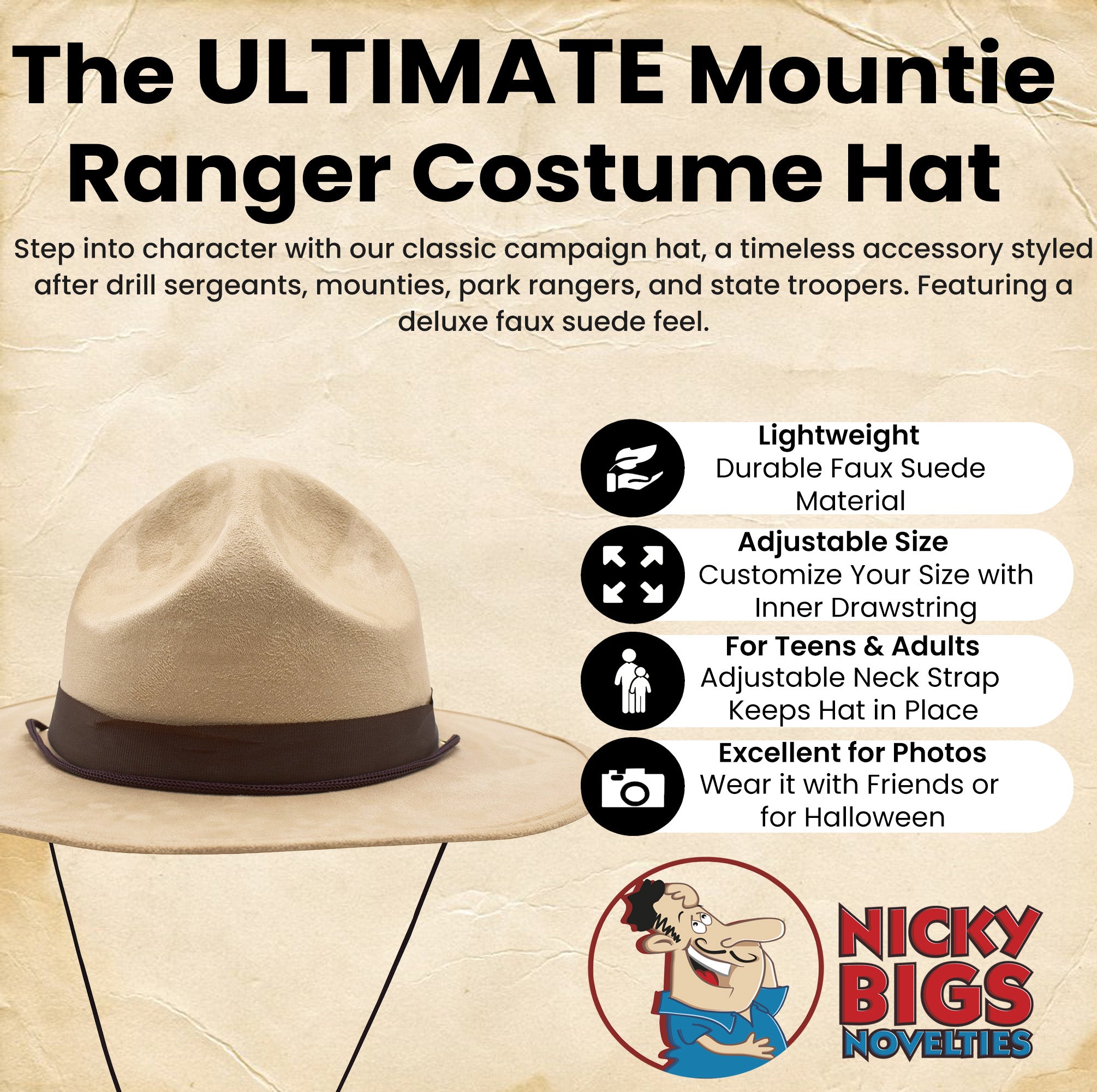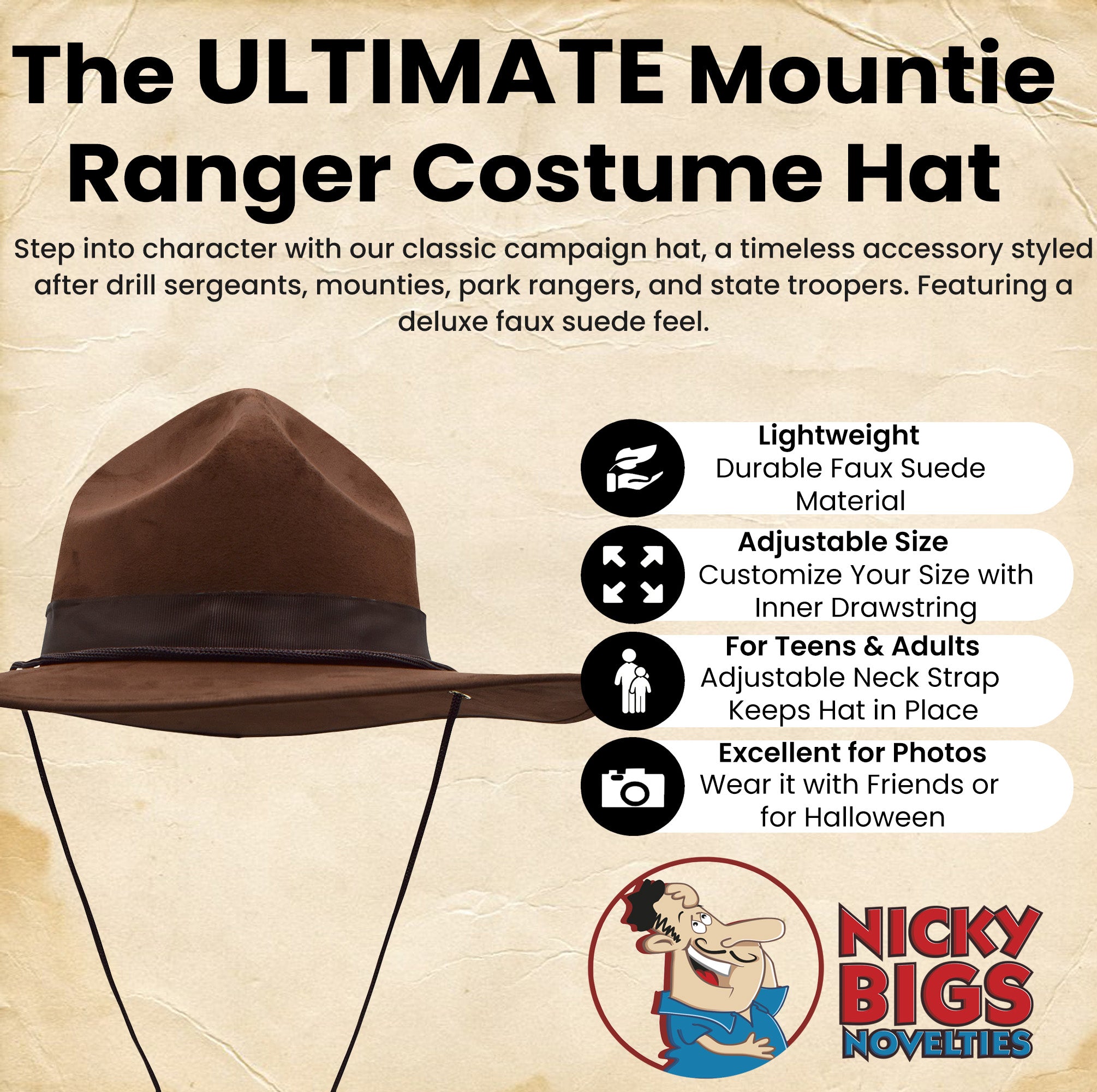 Versatile enough for different occasions, this campaign hat suits a variety of characters and themes. Its a great addition to Halloween ensembles, role-playing activities, and film or stage productions. Whether dressing as a game warden, park ranger, army instructor, or archaeologist, this hat completes the look with style. Ideal for themed gatherings, law enforcement portrayals, and historical outfits, its a standout accessory for men and women.