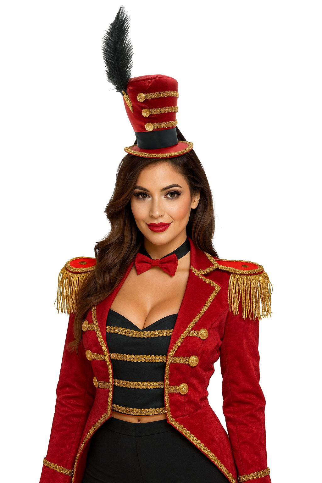 • Bold Circus-Inspired Design: This red mini top hat features gold braided trim, faux buttons, and a dramatic black feather, delivering the flair of a true ringmaster or toy soldier with eye-catching elegance.