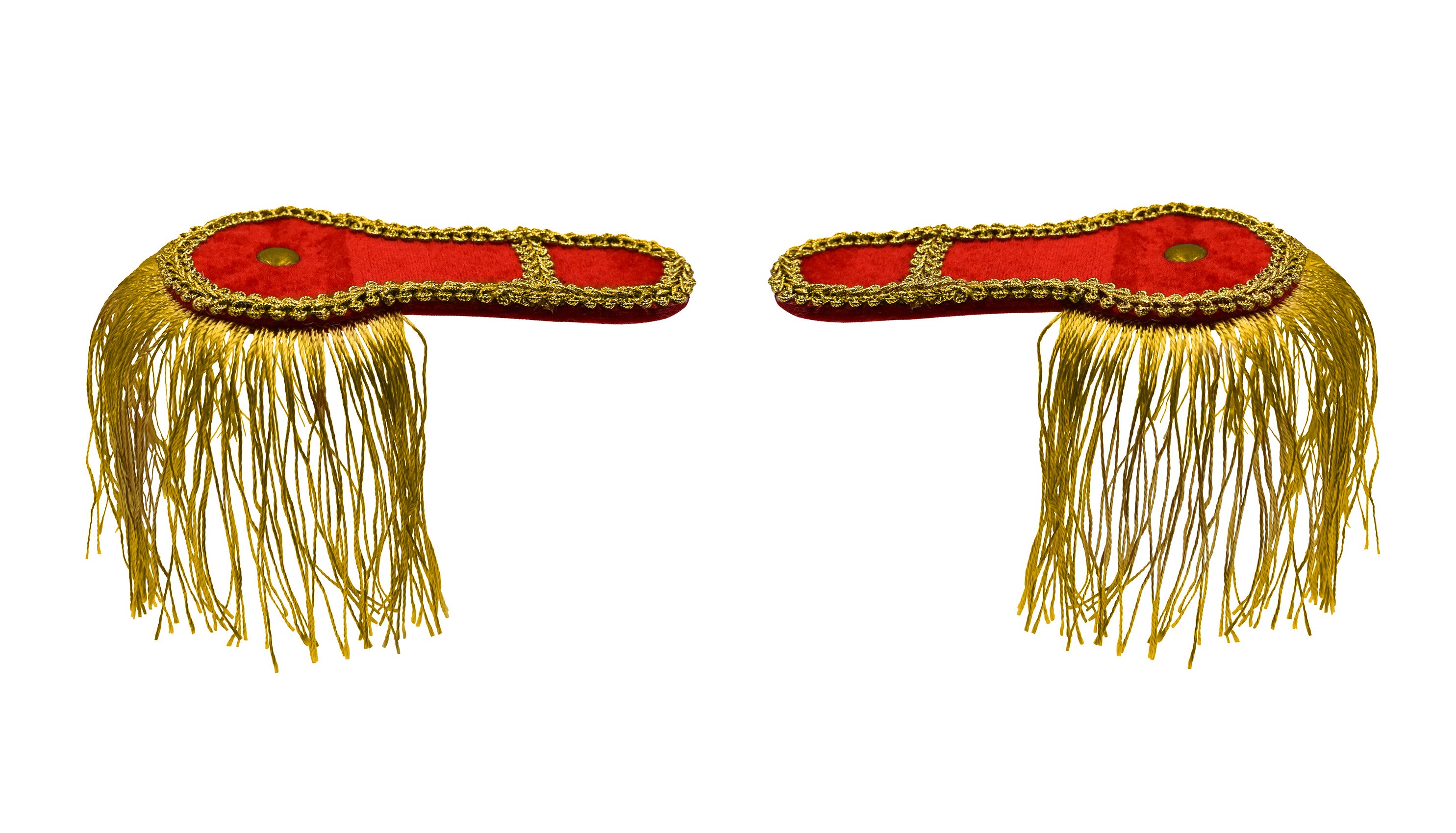 This set also includes a pair of plush black velvet shoulder epaulettes, trimmed with gold braid and finished with shiny gold fringe and faux buttons. At approximately 6 inches in length, with 3-inch hanging fringe, they attach easily and securely with included pins, making them ideal for performers on the move.