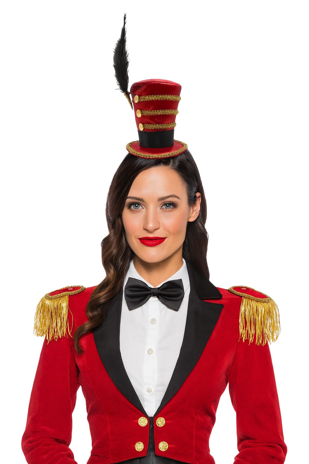 • Bold Circus-Inspired Design: This red mini top hat features gold braided trim, faux buttons, and a dramatic black feather, delivering the flair of a true ringmaster or toy soldier with eye-catching elegance.