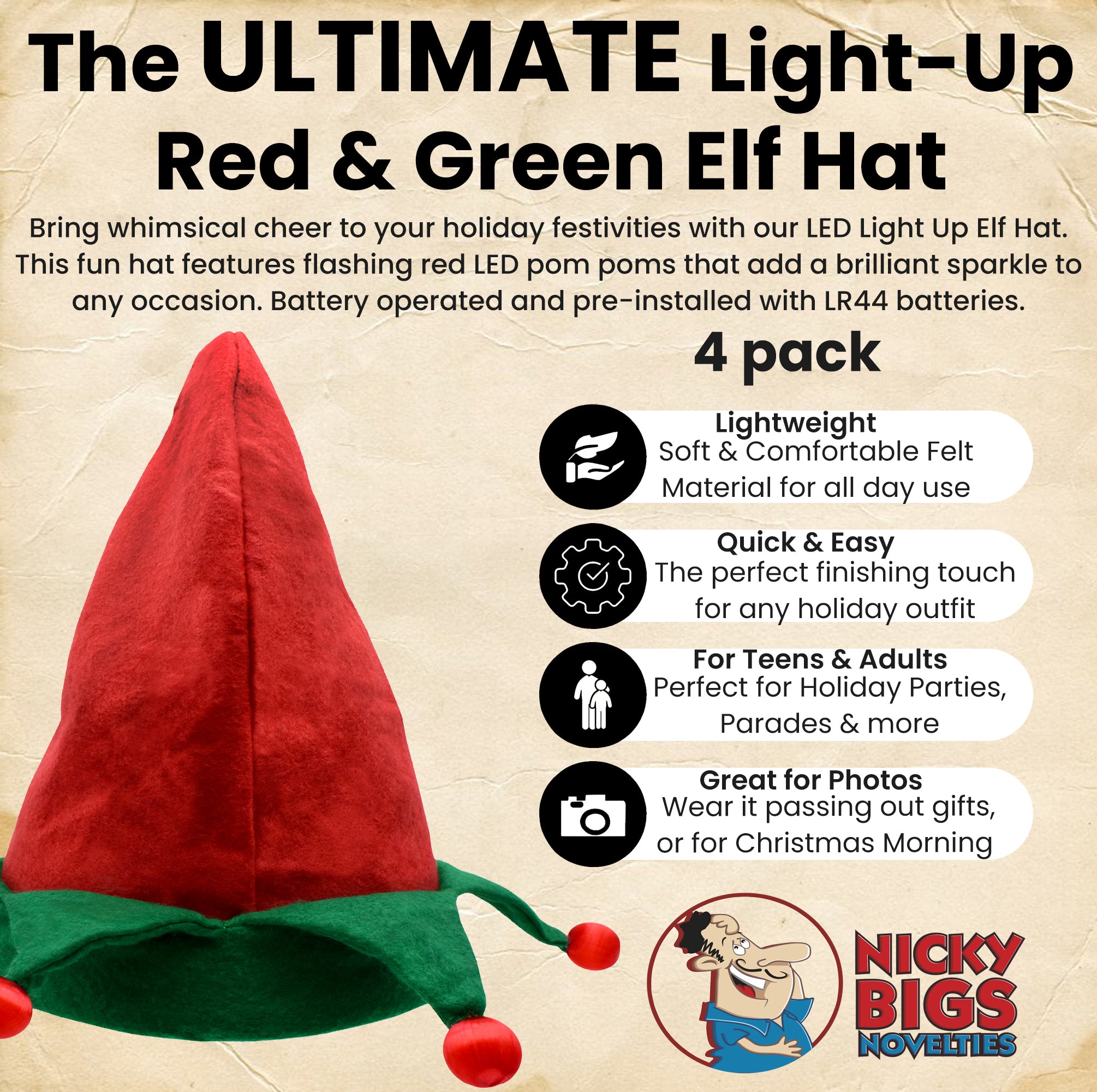 Nicky Bigs Novelties LED Light Up Elf Hat for Adults Ugly Sweater Christmas Hats Red Green Holiday Santas Helper Costume Accessory with Flashing Pom Poms Festive Felt Christmas Cap One Size Fits Most