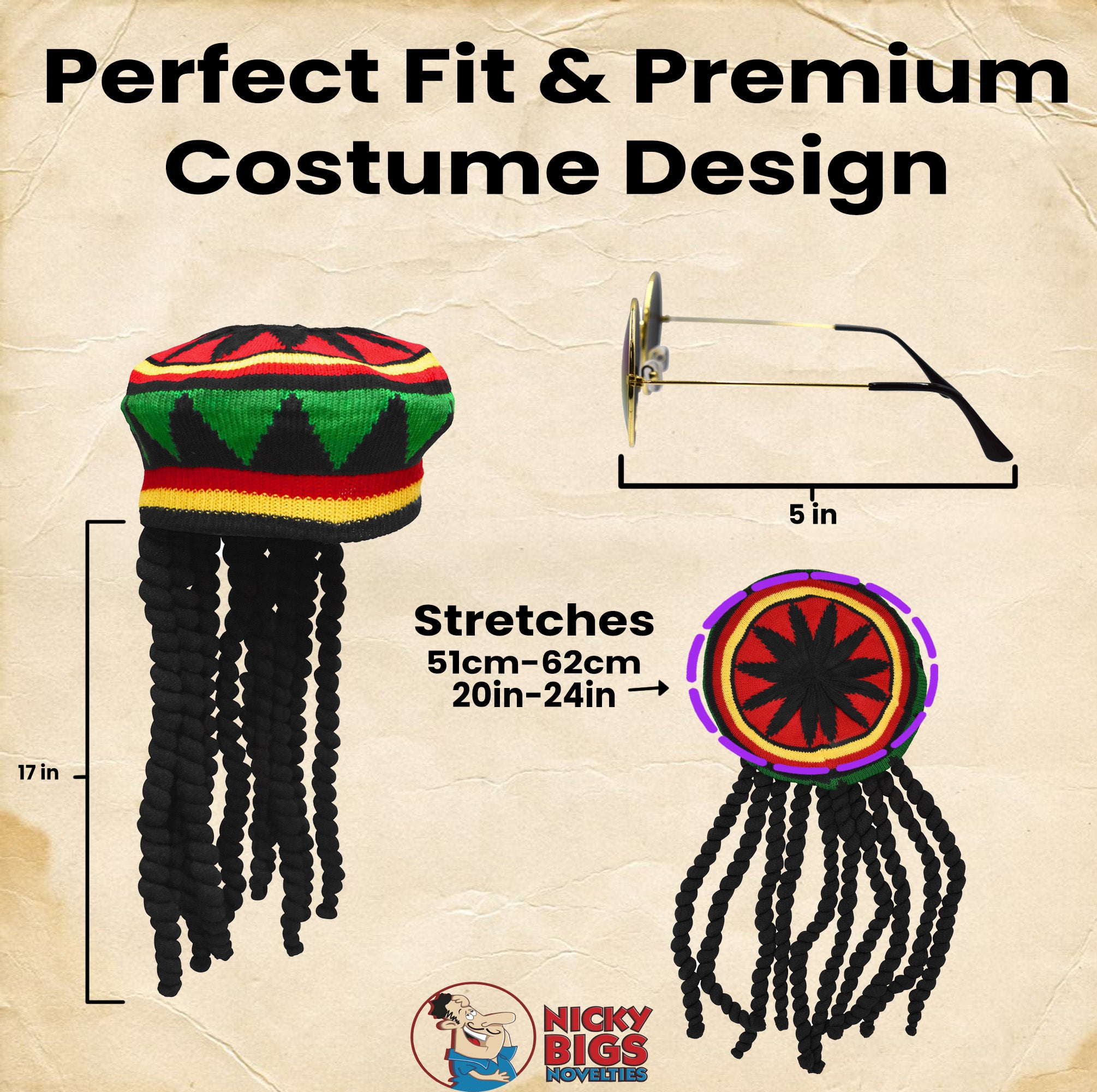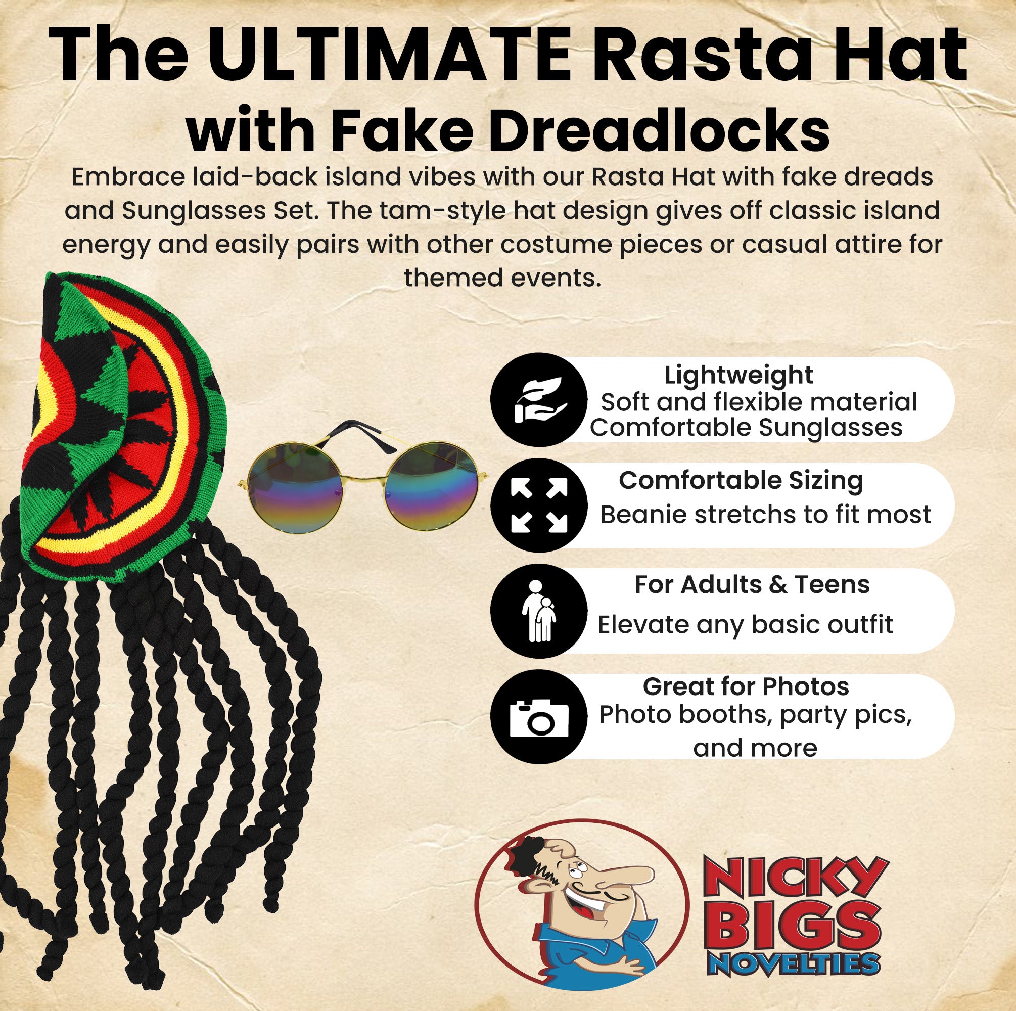 Embrace laid-back island vibes with the Nicky Bigs Novelties Rasta Hat with Fake Dreads and Round sunglasses set, a bold and fun accessory perfect for costumes, cosplay, or festival wear. This adult-sized crochet-style tam hat features the iconic Rasta colors—red, yellow, green, and black—paired with 10 long, black faux dreadlocks, each measuring approximately 17 inches.