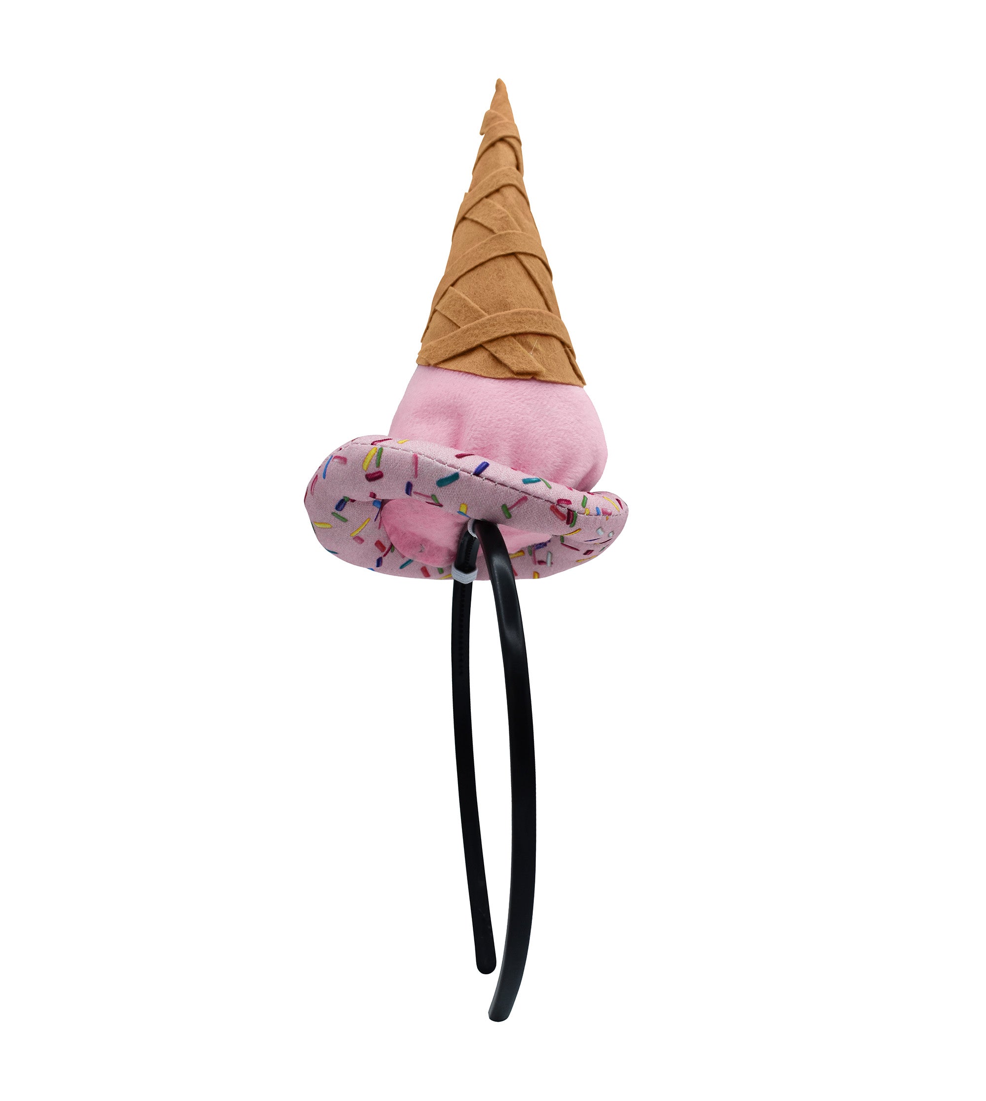 Sprinkle some fun into your next event with the Nicky Bigs Novelties Ice Cream Cone Headbanda sweet accessory designed to capture attention and smiles. This plush mini hat sits upside down atop a comfortable black headband, complete with a soft pink scoop, detailed waffle cone, and sprinkle-covered base. Measuring 7 inches tall and 3.5 inches wide, this head-turning cone makes a big statement without being bulky.